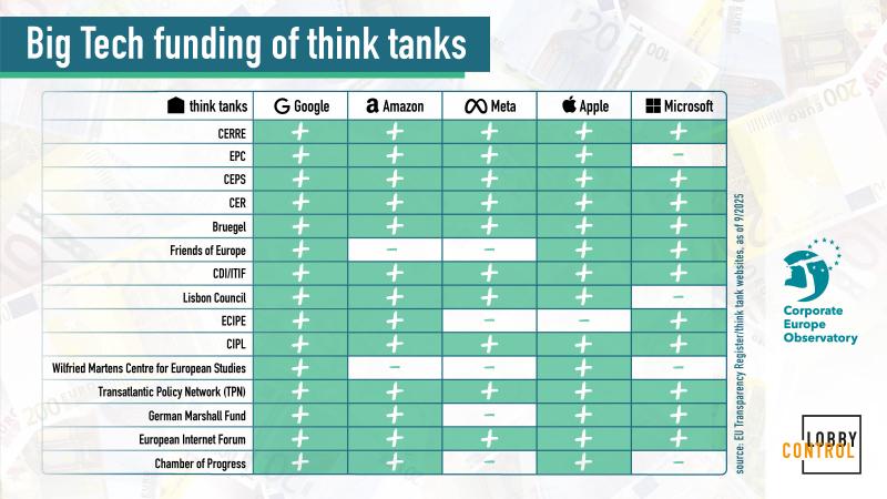 Die Zahl der für die IT-Branche tätigen Lobbyisten in Brüssel ist ebenfalls angestiegen: 2023 waren es 699 Personen, mittlerweile sind es 890 – und damit mehr, als das Europäische Parlament an Abgeordneten hat. Von Januar bis Juni 2025 trafen sich Vertreter der Tech-Konzerne 146-mal mit hochrangigen Mitarbeitern der Europäischen Kommission. Meta führt auch diese Liste mit 63 Gesprächen an – gefolgt von Amazon (49), Google und Apple (jeweils 47). Treffen mit persönlichen Mitarbeitern von Abgeordneten des Parlaments werden nicht erfasst, sodass das CEO von noch höheren Zahlen ausgeht. Ferner würden Denkfabriken eine Schlüsselrolle zukommen, welche ebenfalls finanzielle Zuwendungen der Tech-Unternehmen erhalten: