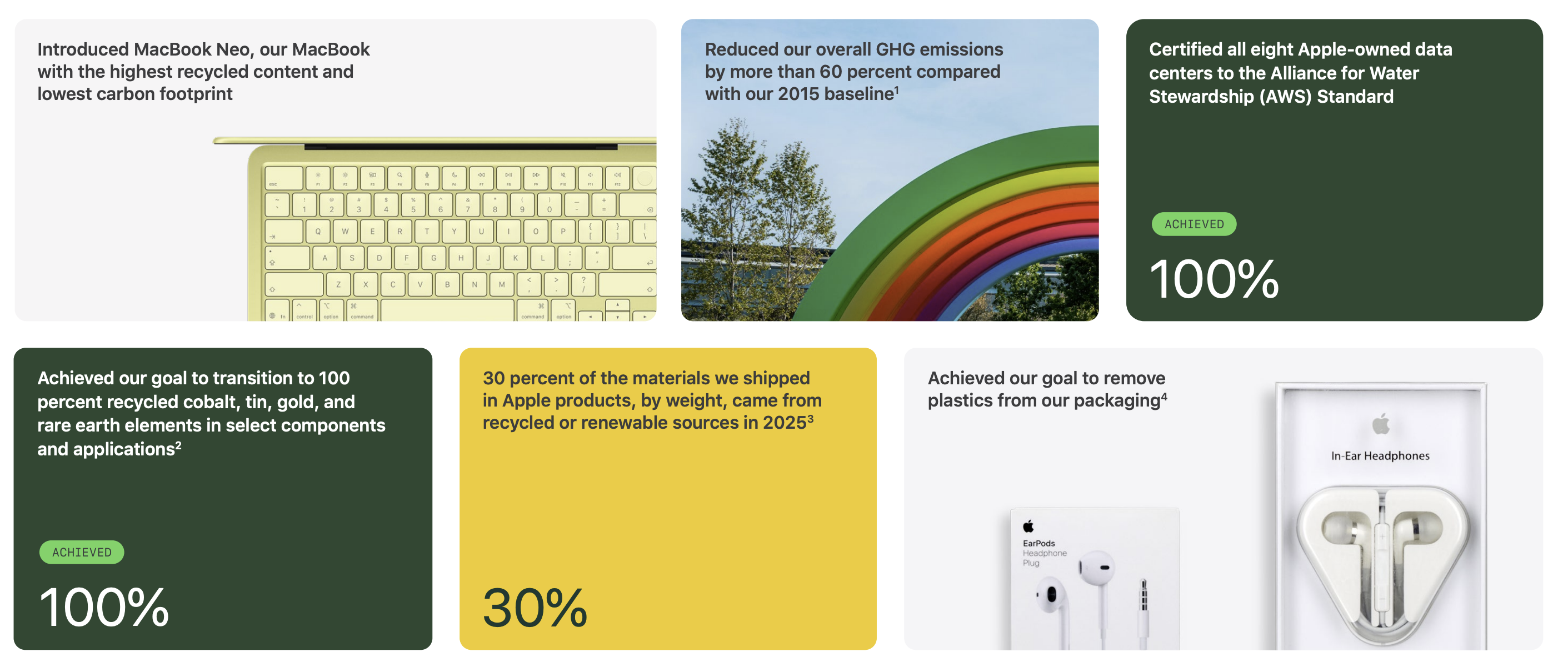 Umwelt-Seite führt Apple diese Fortschritte mit vielen Beispielen aus. Der Konzern nennt mehr als 38 Millionen Megawattstunden aus dem Supplier-Clean-Energy-Programm im Jahr 2025, 100 Prozent faserbasierte Verpackungen für alle neuen Produkte und besonders prominente Einzelbeispiele wie das MacBook Neo. Erneut heißt es, dieses bestehe zu 60 Prozent aus wiederverwerteten Materialien – wenngleich Apple hier auf die marketingfreundliche Maßeinheit "recycelte Materialien in Relation zum Gesamtgewicht" umstellte. Das Alu-Gehäuse kommt bei diesem leichten Gerät auf einen so großen Anteil, dass man den Wert einfach erreichte.