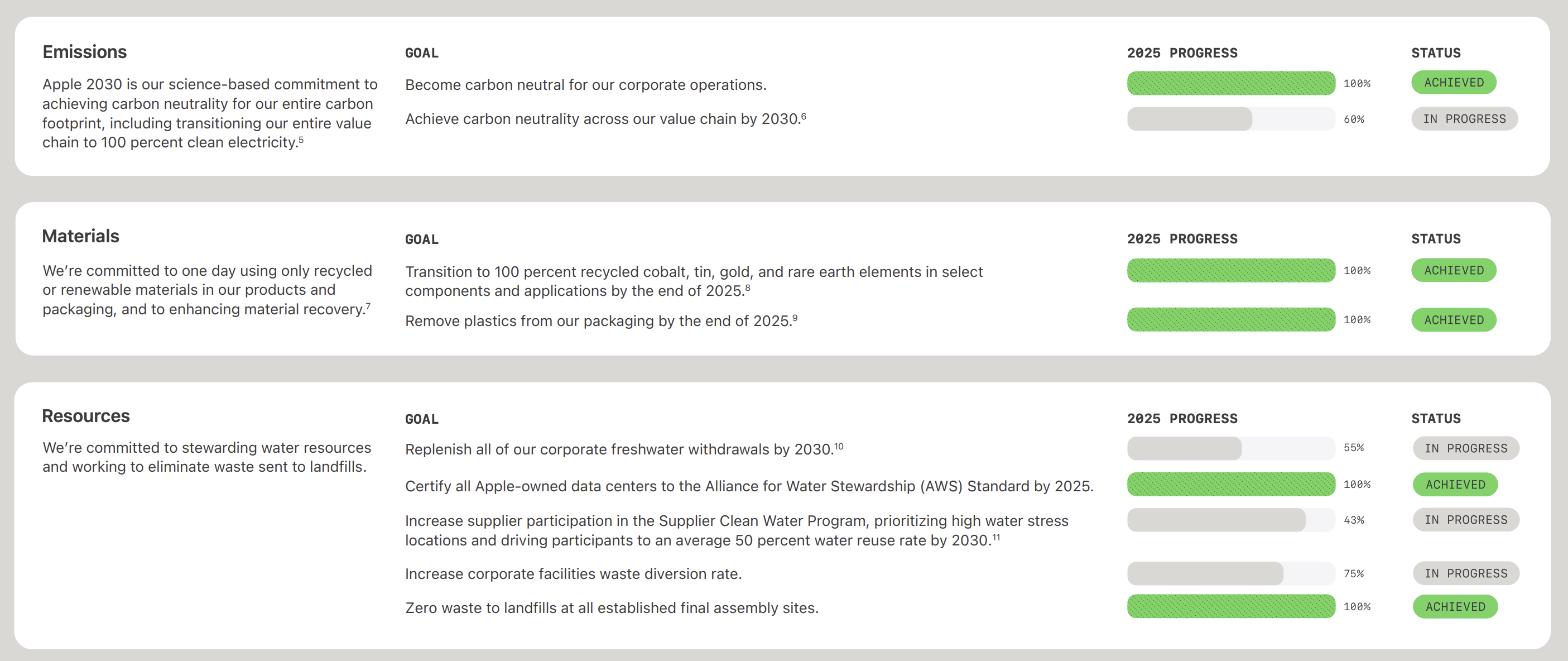 Apple und das Umweltschutz-Mantra – Echtes Vorbild oder Greenwashing und PR-Inszenierung?" sinngemäß ausgeführt hatten: Apple setzt im Vergleich zu vielen anderen Technikkonzernen tatsächlich auf eine ungewöhnlich konkrete und ausgeprägte Umweltstrategie. In der Selbstdarstellung pickt man sich aber natürlich solche Beispiele heraus, die nach umfassenden Erfolgen klingen. Weiterhin bestehende hohe Restemissionen, schwer messbare Modellannahmen und die spätere Abhängigkeit von Ausgleichsmaßnahmen erhalten in den Pressemitteilungen jedoch weniger Gewicht. Die genannten Punkte verschweigt Apple im ausführlichen Bericht allerdings keineswegs und visualisiert sie unter anderem in dieser Schaugrafik: