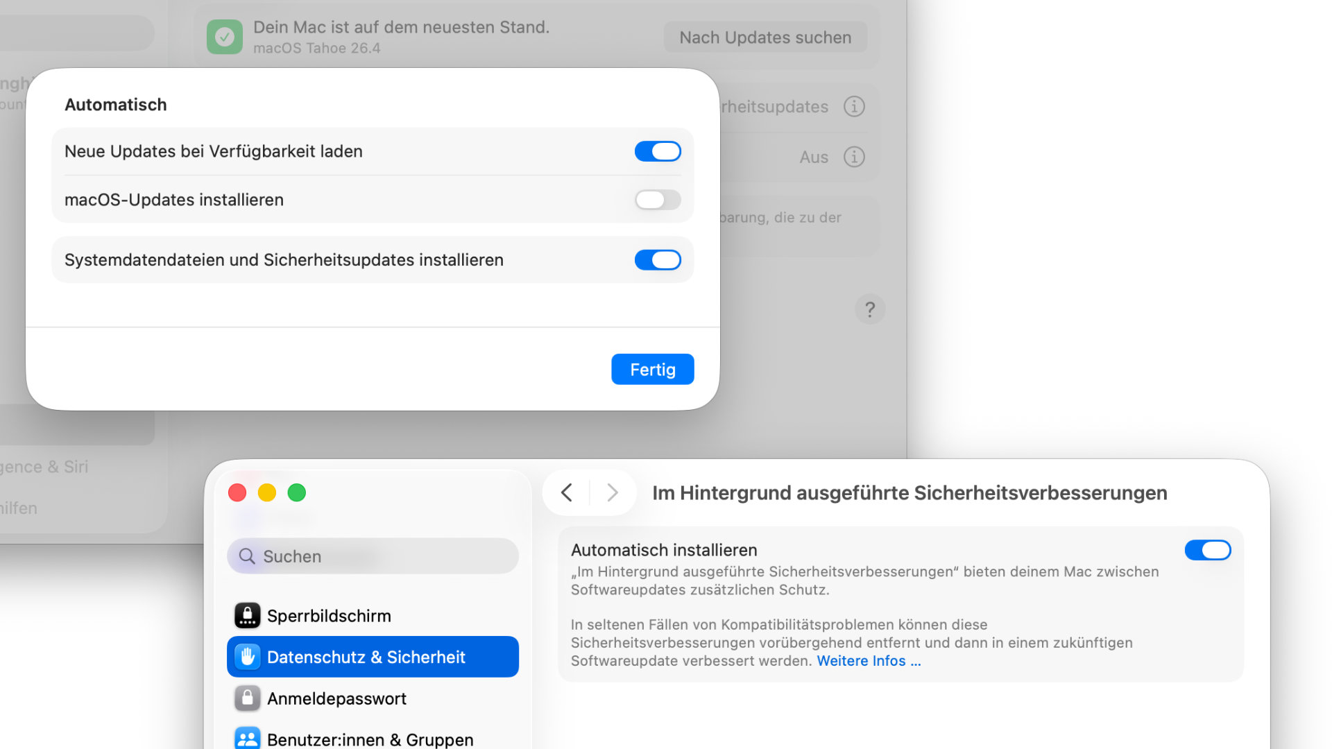 Eine Update-Funktion, versteckt in DatenschutzIn macOS 13 (Ventura) bis 15 (Sequoia) residiert die RSR-Option in der Einstellungen-App unter Allgemein/Softwareupdate. Durch einen Klick auf das Informations-Icon rechts neben „Automatische Updates“ gelangen Nutzer zum Einstellungsdialog, welcher automatische Aktualisierungen für App Store, System und Sicherheit kombiniert. Unter macOS 26 (Tahoe) gibt es nun zusätzlich die Einstellungen unter „Datenschutz & Sicherheit“. Irritierenderweise bleibt die alte Einstellung zu "Systemdateien und Sicherheitsupdates" erhalten – also gibt es im Prinzip zwei Schalter für eine auf den ersten Blick deckungsgleiche Funktion. Standardmäßig sind beide aktiv. Obendrein verwirrend: Der Schalter der neueren Funktion ist mit „Automatisch installieren“ beschriftet, obwohl sie (unter macOS) lediglich auf die Verfügbarkeit einer Aktualisierung hinweist.