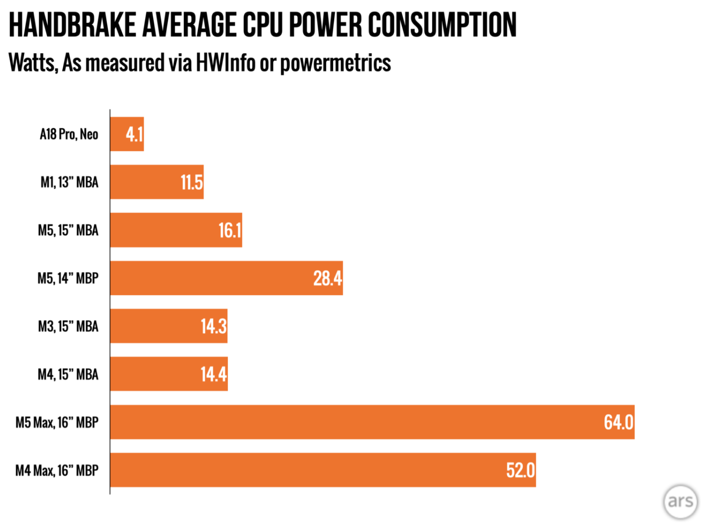 Zu sehen: Taktrate der P-Kerne geht schnell deutlich zurück – anders als bei M1 und M5 Single Core: Top – Multi Core: Schneller EinbruchBei kurzer Single-Core-Belastung ist der A18 Pro dem alten M1 teils klar überlegen und liegt in Geekbench 6 rund 42 Prozent vorn. Unter längerer Last kippt das Bild jedoch: In Multi-Core-, Video-Encoding- und 3D-Tests erreicht das Neo laut Ars oft nur rund 70 Prozent der Leistung des M1 MacBook Air. Der Hauptgrund sei der extrem niedrige Energiehaushalt des A18 Pro, der bei voller CPU-Last nur rund 4 Watt aufnimmt – gegenüber 11,5 Watt beim M1 Air. Allerdings sei das Neo nicht thermisch am Limit, sondern eher künstlich in einem "Smartphone-artigen Energieprofil" gehalten. Obwohl das Neo für dieselbe Aufgabe länger braucht, verbraucht es insgesamt weniger Energie als M1 bis M5, weil der Chip so wenig Leistung aufnimmt.