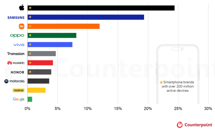 Counterpoint Research bringt es Apple inzwischen auf knapp 25 Prozent – was bedeutet, dass jedes vierte weltweit eingesetzte Smartphone ein iPhone ist. Das ist natürlich weit von Nokias früheren Werten entfernt (zumal klassische Mobiltelefone weiterhin auf etwa 10 Prozent kommen), dennoch ein erstaunlich hoher Wert. Obwohl Apple lediglich im Hochpreissektor aktiv ist, lässt man Hersteller wie Samsung (18 %), Xiaomi (12 %) oder Oppo (8 %) weit hinter sich.
