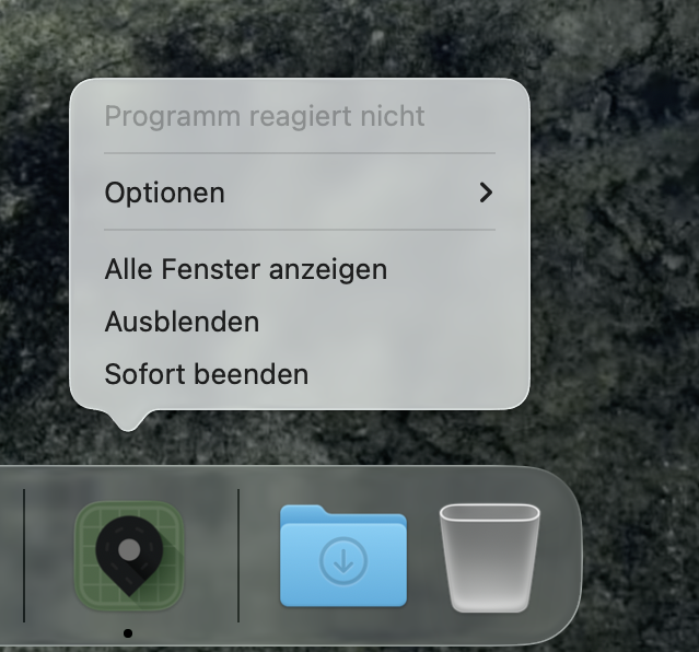 +Tab in den Finder wechseln, um das nicht reagierende Programm über das Dock-Menü zu beenden.