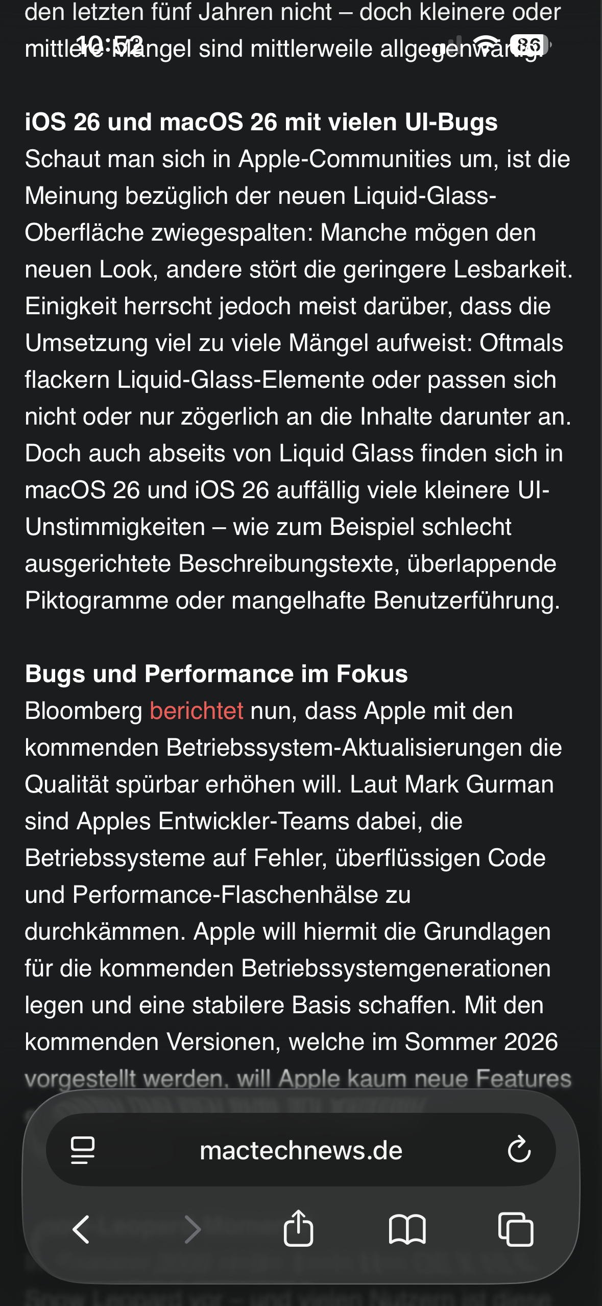 iOS 26 und macOS 26 mit vielen UI-BugsSchaut man sich in Apple-Communities um, ist die Meinung bezüglich der neuen Liquid-Glass-Oberfläche zwiegespalten: Manche mögen den neuen Look, andere stört die geringere Lesbarkeit. Einigkeit herrscht jedoch meist darüber, dass die Umsetzung viel zu viele Mängel aufweist: Oftmals flackern Liquid-Glass-Elemente oder passen sich nicht oder nur zögerlich an die Inhalte darunter an. Doch auch abseits von Liquid Glass finden sich in macOS 26 und iOS 26 auffällig viele kleinere UI-Unstimmigkeiten – wie zum Beispiel schlecht ausgerichtete Beschreibungstexte, überlappende Piktogramme oder mangelhafte Benutzerführung.