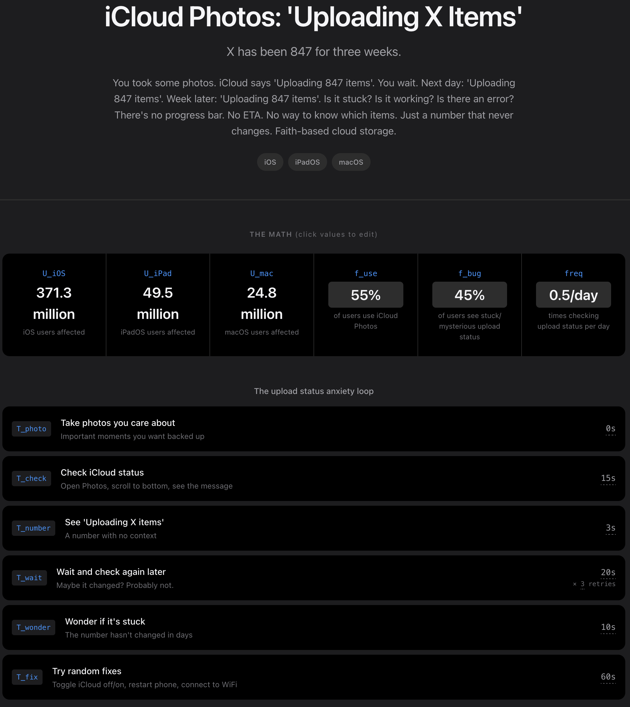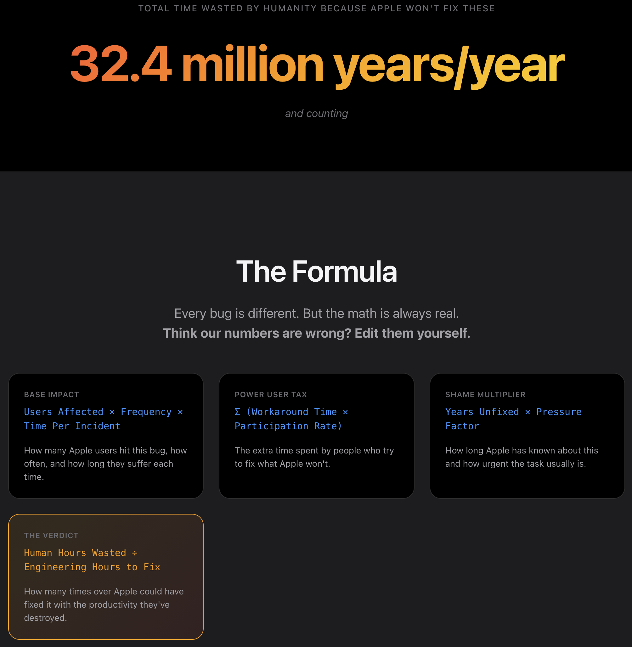 Apple hält an Bugs fest – Nutzer verlieren dadurch ZeitApple muss Bugs einfach lieben – warum sollte das Unternehmen sonst so lange an ihnen festhalten, fragt die Seite bissig und spöttisch. Sie wendet auf humorvolle Art verschiedene Berechnungsformeln an, um den Zeitverlust zu eruieren, den Anwender im Alltag erdulden müssen.
