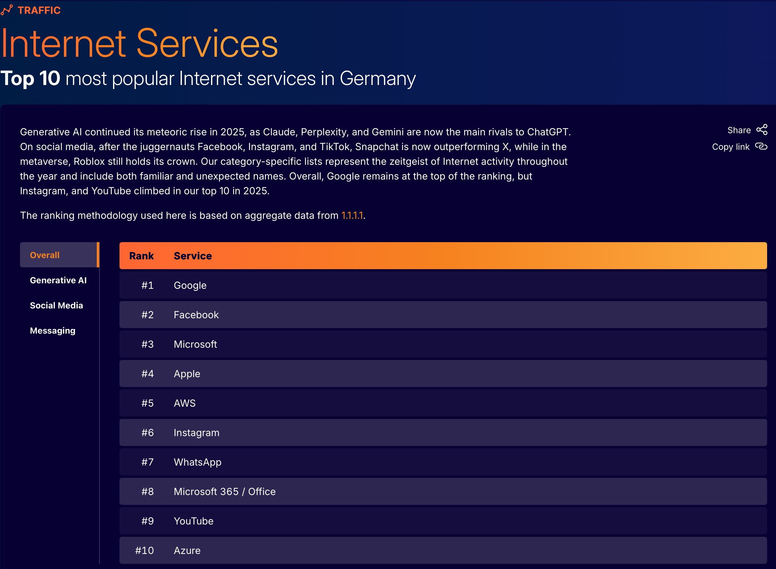 Im Verlauf des Jahres übertraf der Anteil von Apples Diensten im weltweiten Datenverkehr erstmals den des Konkurrenten Microsoft. Beschränkt man die Cloudflare-Analyse auf Datenströme in Deutschland, liegt Apple noch immer hinter der Konkurrenz aus Redmond. Das bedeutet allerdings immer noch einen respektablen vierten Platz. Interessant dabei: Apple findet sich in keiner der präsentierten Unterkategorien (Video-Streaming, Messaging, Generative AI etc.) unter den zehn Bestplatzierten – es ist vielmehr die Kombination sämtlicher Angebote, welche Apple den dritten Platz der beliebtesten Internetdienste bescherte.