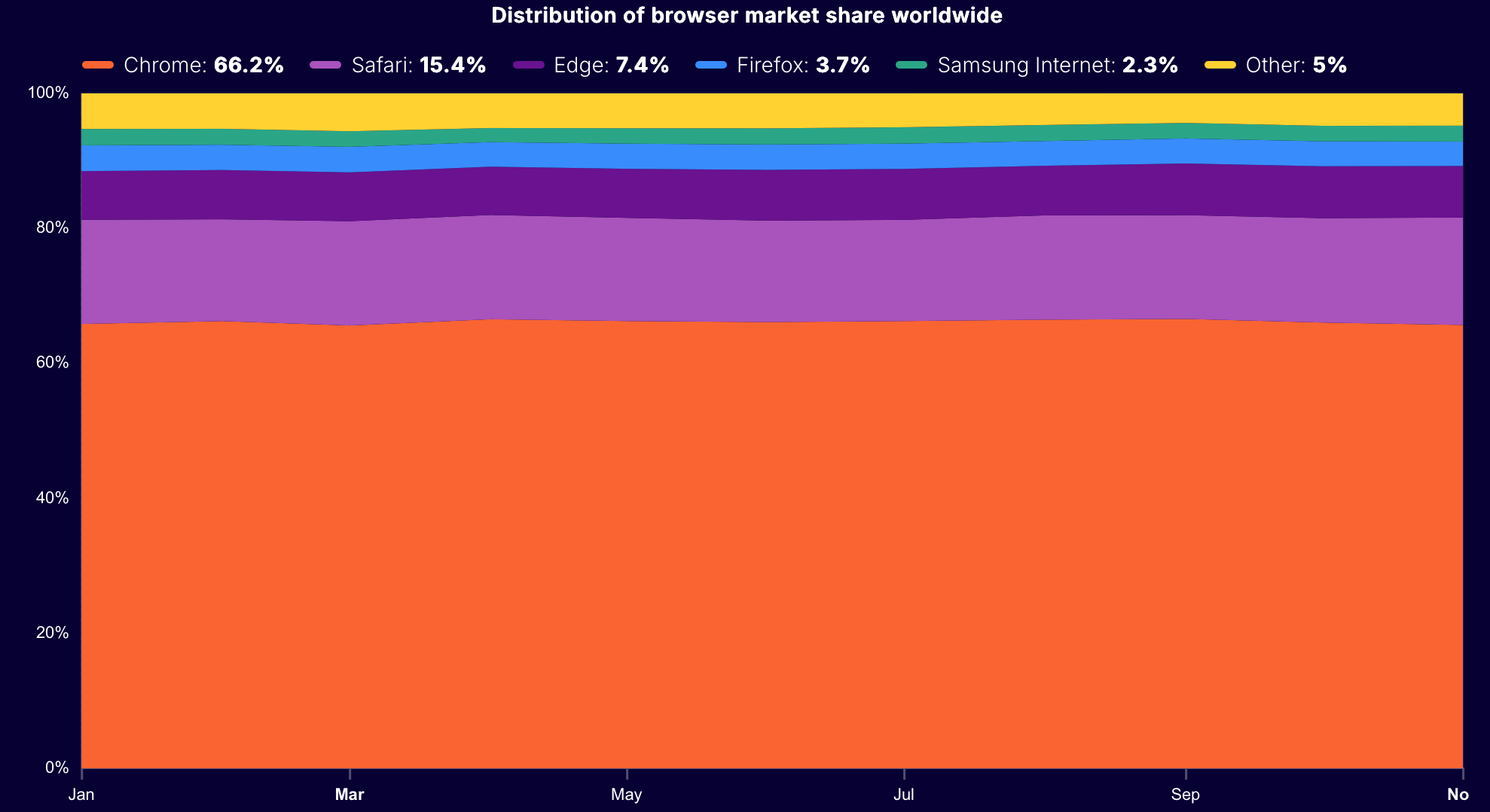 Safari auf Platz zweiAuch in der Statistik der beliebtesten Seitenbetrachter spielt Apple ganz weit vorn mit: Im weltweiten Netz belegt Safari den zweiten Platz. Dies bedeutet allerdings lediglich einen Marktanteil von 15,4 Prozent – Googles Chrome kratzt mit 66,2 Prozent an der Grenze zur Zweidrittelmehrheit. Die Marktmacht gilt auch unter macOS: 60 Prozent des Internetverkehrs am Mac liefen 2025 über Googles Browser. Den zweiten Platz unter Safari verdankt Apple hauptsächlich der iOS-Version: Insgesamt werden mittlerweile 47 Prozent aller Daten von Mobilgeräten angefordert, bei denen Apple einen Anteil von 35 Prozent einnimmt – immerhin zwei Prozent mehr als 2025. Unter iOS kann Safari wiederum einen Marktanteil von 80 Prozent für sich verbuchen.