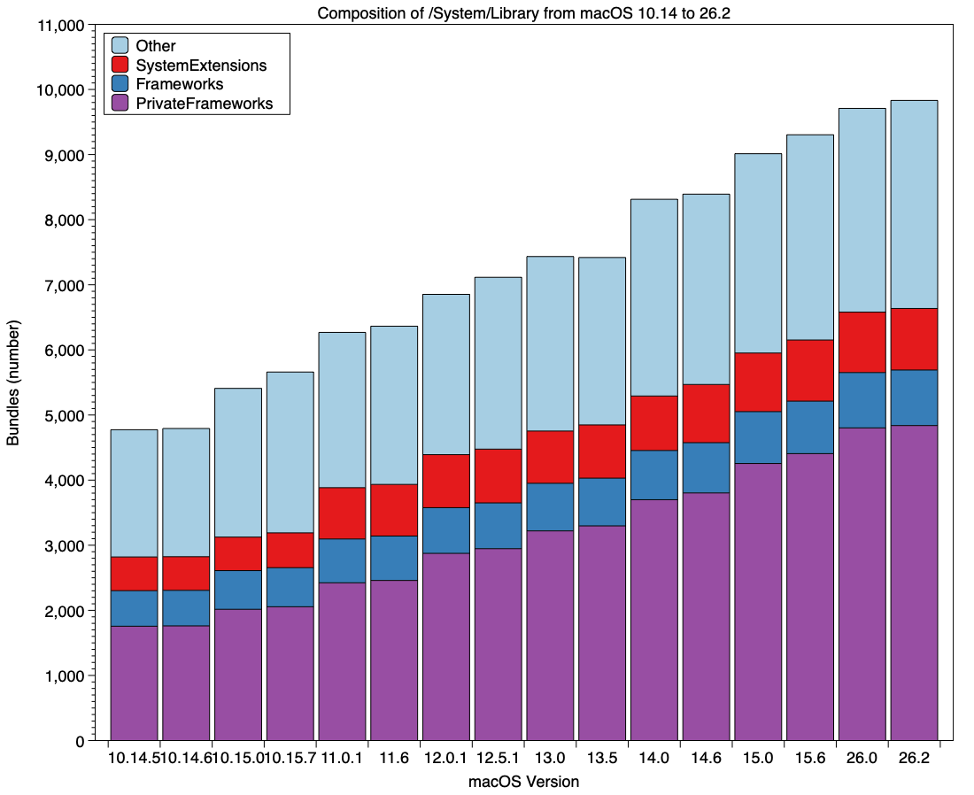 Für diesen Zweck führte Oakley eine automatisierte Zählung sämtlicher Bundles durch, welche sich im Ordner „/System/Library“ befinden. Als Startpunkt für seinen Vergleich wählte er macOS 10.14 (Mojave), welches im September 2018 erschien. Die Anzahl der Bundles der System-Library hat sich mittlerweile verdoppelt – von 4.800 auf gut 9.800. Auch die Kernel-Erweiterungen nahmen an Umfang zu: Tahoe umfasst knapp 950; in macOS 10.15 waren es 515.