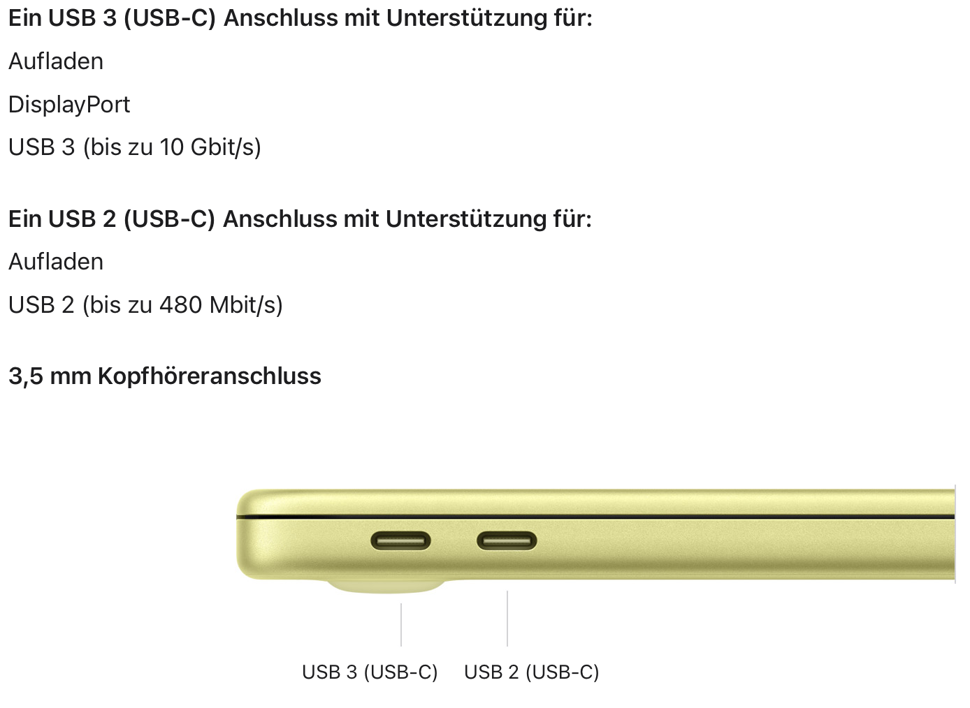 Während das Gerät zwei Anschlüsse vom Typ USB-C aufweist, fehlt MagSafe allerdings. Wer ein einzelnes externes Display anschließen möchte, kann das tun – aber nur bis zu einer Auflösung von 4K und natürlich 60 Hz. Weitere von Apple genannte Spezifikationen sind Wi-Fi 6E und Bluetooth 6, einen N1-Chip verbaut Apple hierfür erwartungsgemäß nicht.