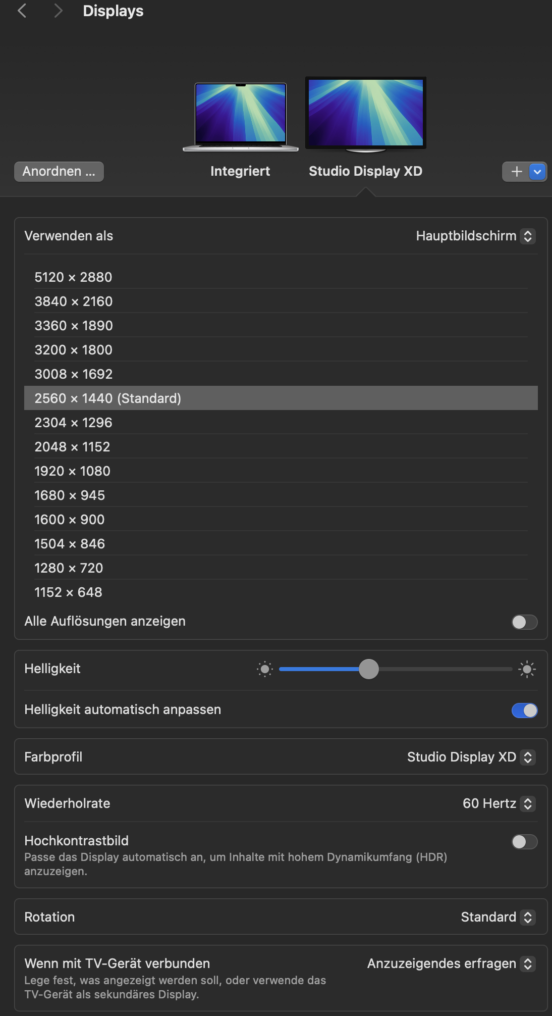 Abgesehen davon sind Apples Angaben aber zumindest etwas irreführend. Apple zieht sich anscheinend darauf zurück, nur "offiziell unterstützte" Konfigurationen nennen zu wollen – und nicht alle Geräte, bei denen von "geht irgendwie auch" die Rede ist. Die Trennung scheint man beim macOS-Farbmanagement mit nahtlosem Umschalten zwischen den 16 Referenzmodi zu ziehen, also dort, wo Apple den professionellen Mehrwert des Displays sieht – nicht jedoch bei der grundsätzlichen Bildausgabe an sich.