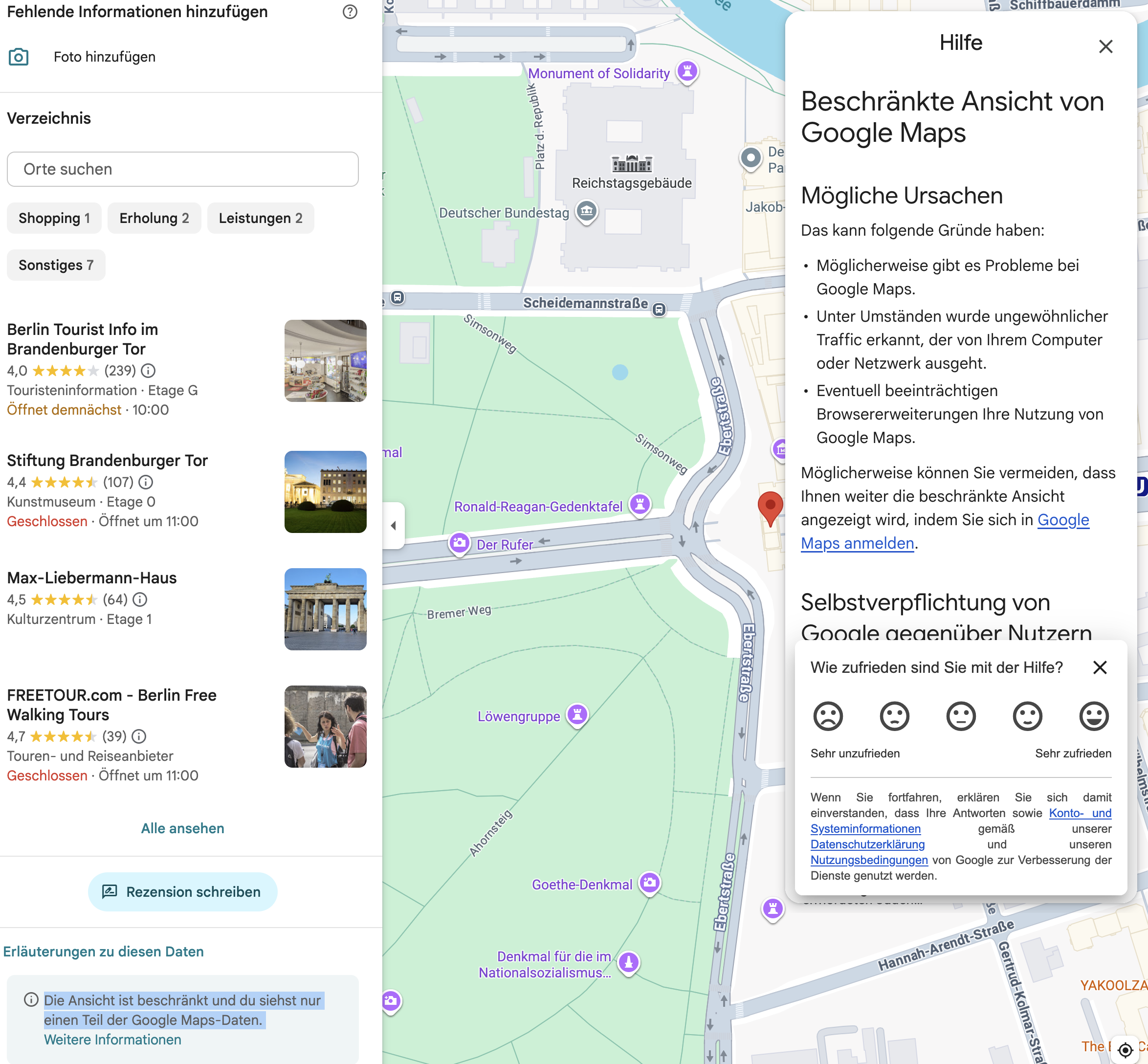 Maps ohne Account: Bewertungen und viele weitere nützliche Informationen verschwindenEin Google-Konto geht bei der Nutzung von Maps mit einigen Vorteilen einher: Nutzer können so ihren Suchverlauf synchron halten, Echtzeit-Informationen zur Verkehrslage erhalten und das eigene Unternehmen präsentieren. Für viele übliche Features stellt der Account jedoch keine Voraussetzung dar. Das scheint sich aber gerade zu ändern: Wer Google Maps Maps verwendet, ohne angemeldet zu sein, muss vielfach auf bestimmte Informationen verzichten. So tauchen etwa Nutzerrezensionen nicht auf und es fehlen Details zur Auslastung. Die Bildergalerie mit den Fotos anderer Anwender lässt sich ebenfalls nicht blicken. Google spricht in diesen Fällen von einer „beschränkten Ansicht“: Diese sei womöglich auf Probleme des Dienstes zurückzuführen oder es liege eine Browsererweiterung vor, welche den Service einschränke. Ungewöhnlicher Traffic, der vom Rechner ausgehe, sei ebenfalls als Problem denkbar.