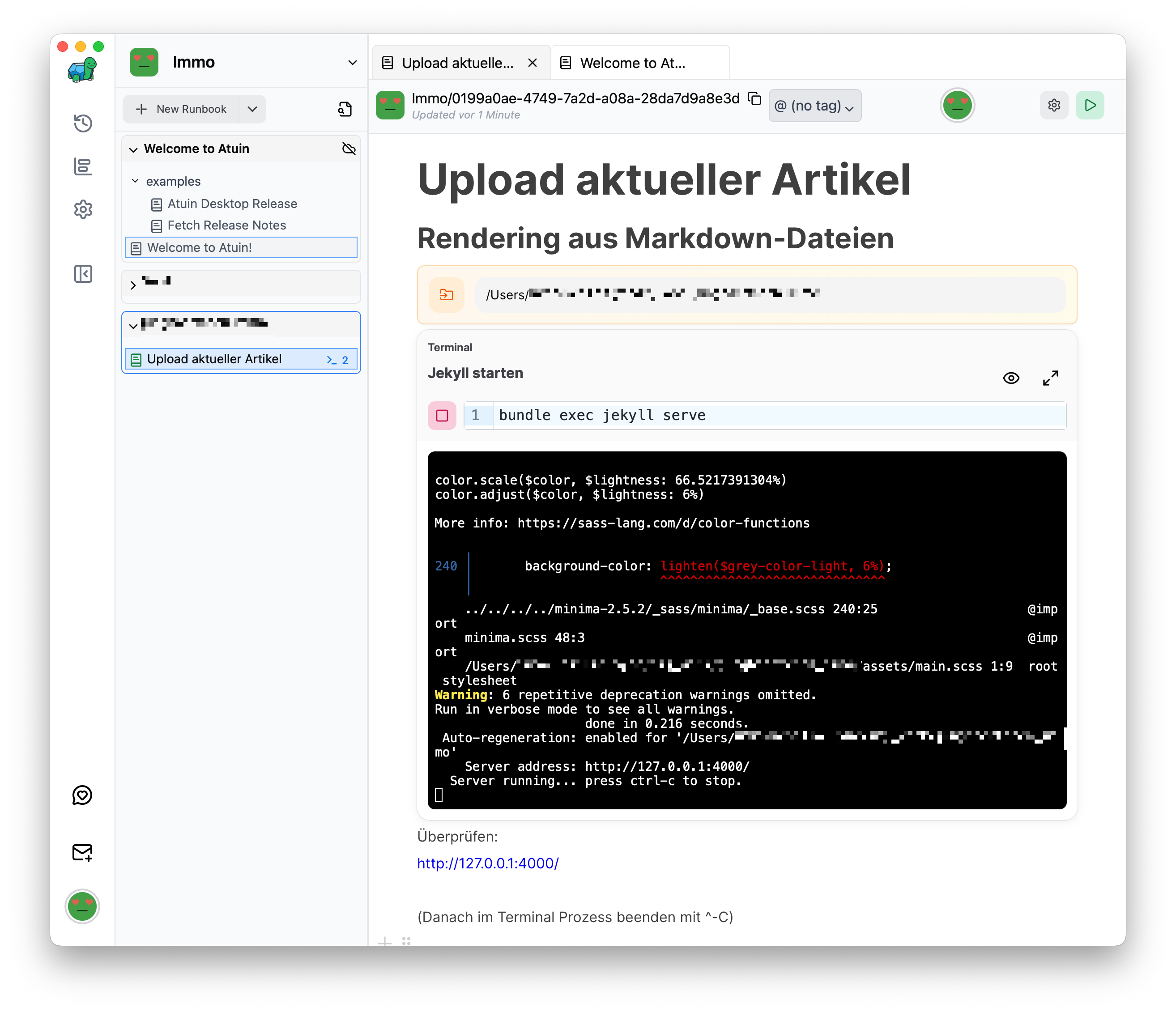 Das Programm erscheint zunächst wie eine Notizenverwaltung, nur dass die einzelnen Hefte Runbooks genannt werden. Zusammengehörige Runbooks werden auf Wunsch zu einem Workspace zusammengefasst; beim ersten Start findet sich der Anwender in einem exemplarischen Workspace namens "Welcome to Atuin" wieder. Es erläutert, wie die App funktioniert und welche speziellen Datentypen Atuin Desktop unterstützt.