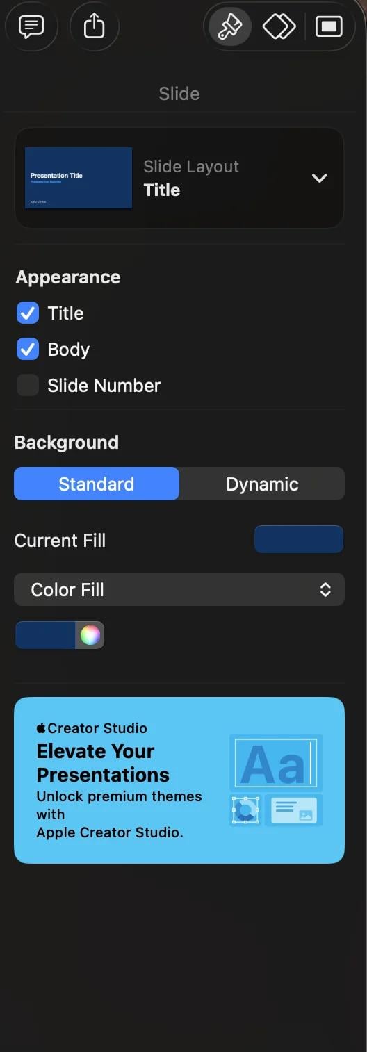 hier). Mit der unlängst veröffentlichten Version 15.1.1 bessert Cupertino zumindest bei Keynote auf dem Mac ein wenig nach: Anwender mussten selbst bei der Bearbeitung des Folienlayouts einen einigermaßen penetranten Hinweis auf das Creator Studio hinnehmen. Dieser gehört nun der Vergangenheit an: