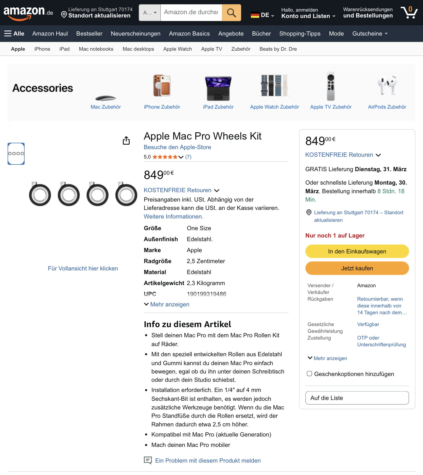 Aus dem Sortiment genommen: Rollen und Standfüße für den Mac ProDer Mac Pro ist Geschichte: Apple verkauft den Tower-Rechner nicht mehr. Wer einen leistungsstarken Desktop-Mac sucht, wird beim Mac Studio fündig. Das Aus für den Mac Pro geht aber auch mit dem Ende bestimmten Zubehörs einher. Das betrifft etwa das Rollen-Kit: Es beinhaltete vier Räder, um den Tower beweglich zu machen. Die aus Edelstahl und Gummi bestehenden Rollen waren zwar hochwertig verarbeitet, allerdings alles andere als ein Schnäppchen: Käufer mussten 849 Euro für das Set auf den Tisch legen.