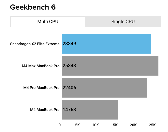18 Kerne mit bis zu 5,0 GHz Taktraten sorgen für jenes Multicore-Ergebnis des Snapdragon, pro Kern ist der Chip indes weniger als zehn Prozent schneller als ein M4. Gegen einen M4 Max kann er nicht anstinken, denn dieser übertrifft das Top-Modell von Qualcomm um rund 2.000 Punkte. Blickt man auf die Grafikleistung, so sind Snapdragon X2 Elite Extreme und M4 Max ungefähr auf Augenhöhe.
