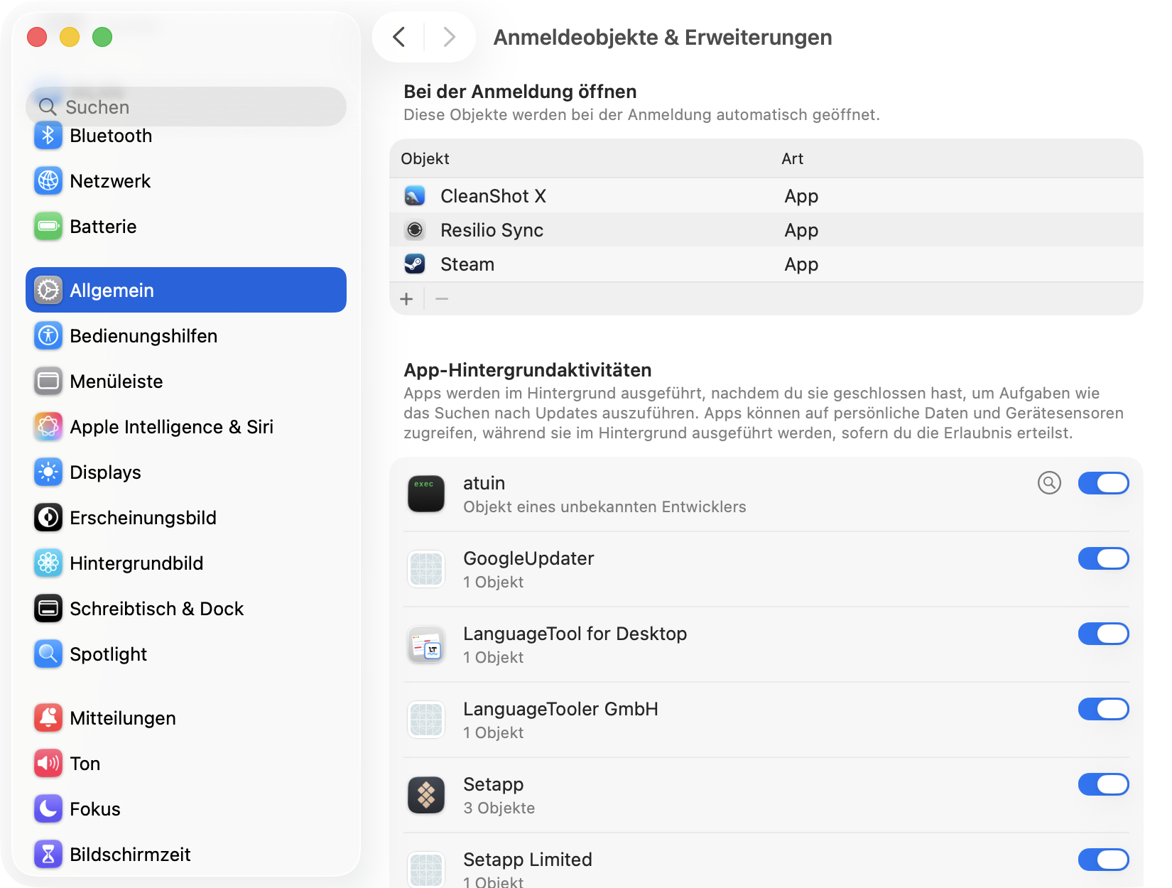 3. Anmeldeobjekte verwaltenIn der Einstellungen-App gibt es eine Ansicht sämtlicher Erweiterungen. Klicken Sie zunächst auf „Allgemein“ und wählen Sie dann „Anmeldeobjekte & Erweiterungen“. Hier erscheinen untereinander Anmeldeobjekte, Hintergrundaktivitäten und Erweiterungen. Erstere lassen sich in dieser Ansicht einwandfrei verwalten: Wählen Sie einen Eintrag aus und klicken auf das Minus-Symbol unter der Liste, um ihn aus den Anmeldeobjekten zu entfernen. Verschwindet das Problem, haben Sie die Ursache aufgespürt. Falls nicht, können Sie die App über das Plus-Symbol wieder hinzufügen – alle Einträge dieser Liste beziehen sich auf eine App im Programme-Ordner. Die darunter angeordneten Hintergrundaktivitäten lassen sich über einen Schalter deaktivieren – es kann jedoch sein, dass diese sich eigenständig erneut einschalten.