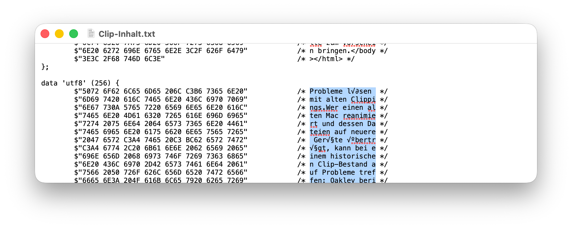 Dieser Befehl schreibt den Inhalt einer Datei namens "Clip" im aktuellen Verzeichnis in eine neue Textdatei mit dem Namen "Clipinhalt.txt". Darin erscheinen oftmals mehrere Versionen desselben Inhalts, sowohl im Binär- als auch im Klartextformat. In TextEdit können Sie den Inhalt der schmalen, über mehrere Zeilen gehenden Inhalt recht einfach extrahieren: