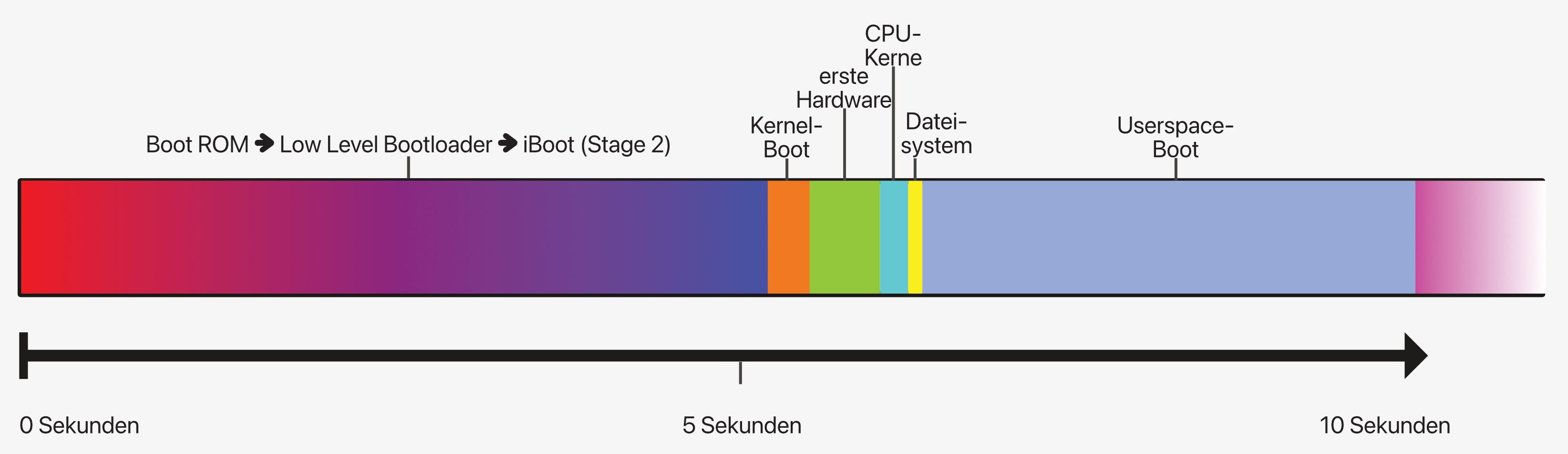 Korrektur der Systemzeit. Gut die Hälfte dieser ersten Phase nehmen drei Stufen ein, die in den Log-Dateien keine Spuren hinterlassen: Das unveränderliche Boot-ROM verifiziert den Low-Level-Bootloader (LLB), welcher wiederum iBoot überprüft und initialisiert. Anstatt Protokollmeldungen in Log-Dateien hinterlassen diese drei lediglich Statusmeldungen im Binärformat, sogenannte Breadcrumbs, welche im NVRAM landen.