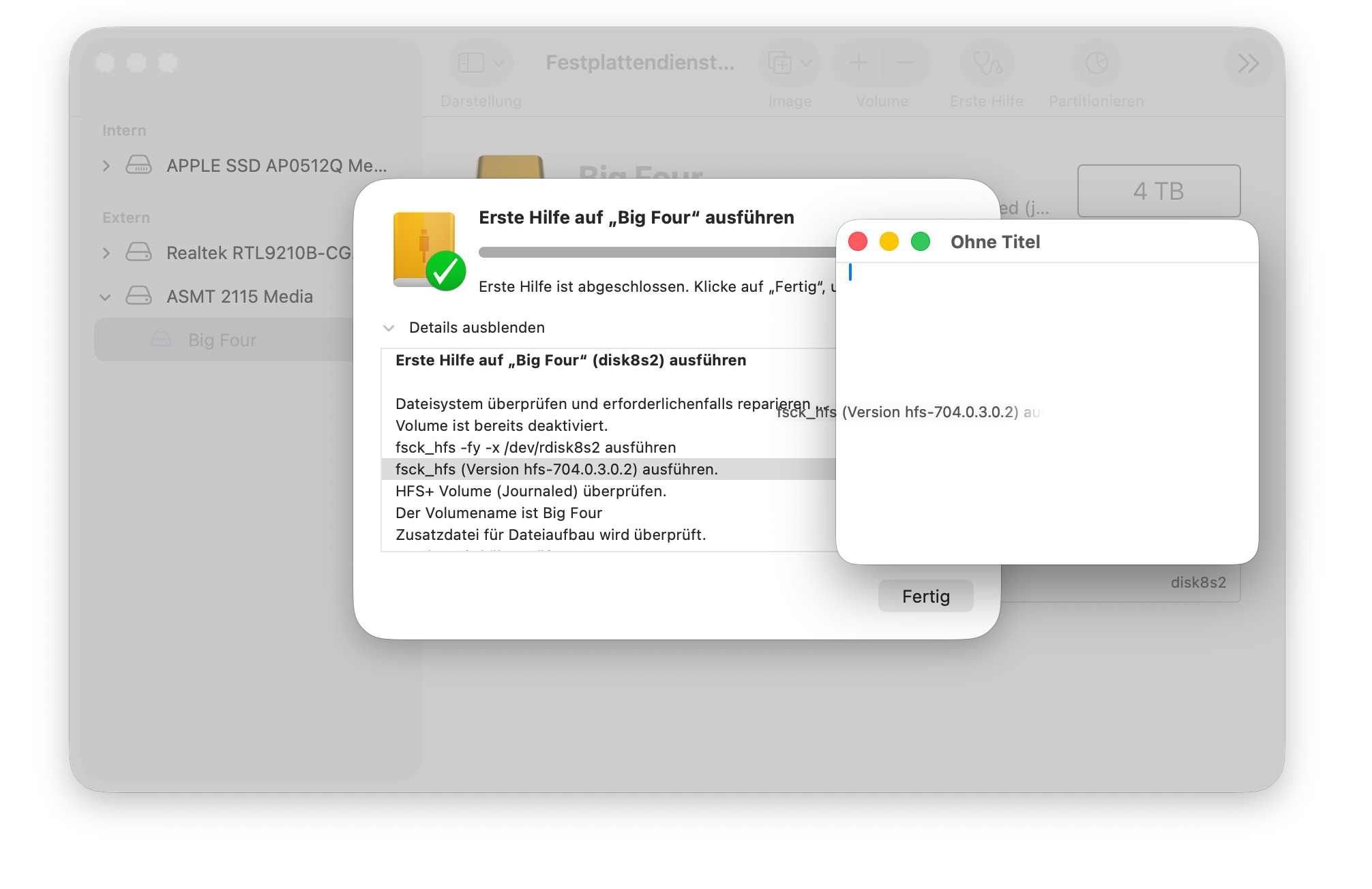 Defekte Dateien aufspürenHartnäckige Fehler im Dateisystem sind oftmals in einzelnen Dateien verortet. Im Fortschrittsfehler der Erste-Hilfe-Funktion erscheint eine unauffällige Zeile namens "Details einblenden". Ein Klick auf das Größer-Symbol zeigt ein Protokoll des Reparaturversuchs. Erscheint darin eine defekte Datei, ist diese mit einer langen Identifikationsnummer (Inode) benannt. Kritisch wird es, wenn dieser Eintrag nicht mit "Warning", sondern mit "Error" versehen ist. Um herauszufinden, um welche Datei es sich dabei handelt, muss man die Inode übersetzen. Dazu übertragen Sie die lange Ziffernfolge erst einmal. Entweder schreiben Sie die Nummer ab, oder Sie ziehen die Zeile(n) mit der Fehlermeldung aus dem Erste-Hilfe-Protokoll in ein TextEdit-Dokument.