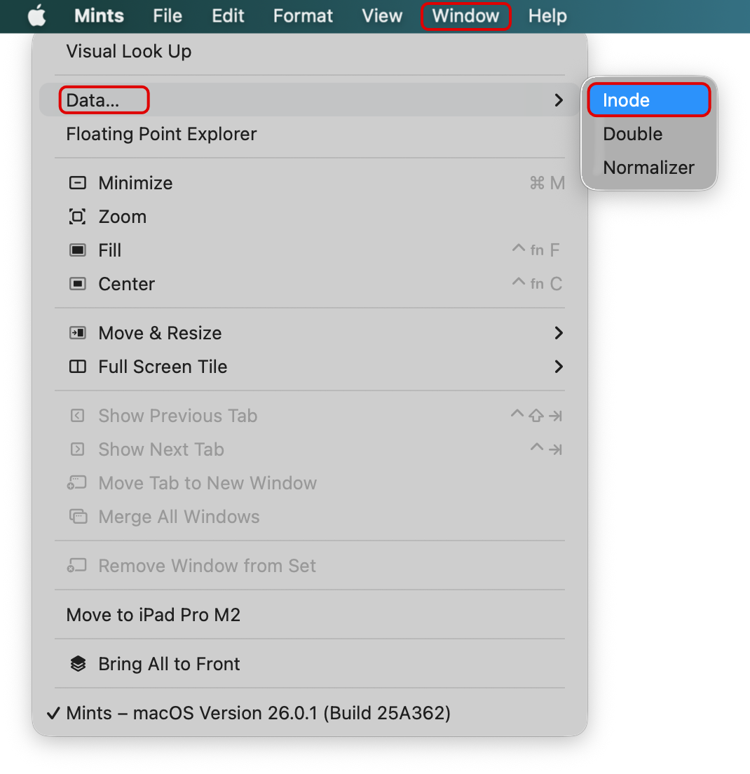 Mints eine Suchhilfe integriert. Sie ist etwas versteckt: Sie müssen im Menü "Window" das Untermenü "Data…" aufklappen und darin "Inode" wählen. Im separaten Fenster "Inode Resolver" können Sie dann den Pfad zur Inode recherchieren. Das ist ein mehrstufiger Prozess: