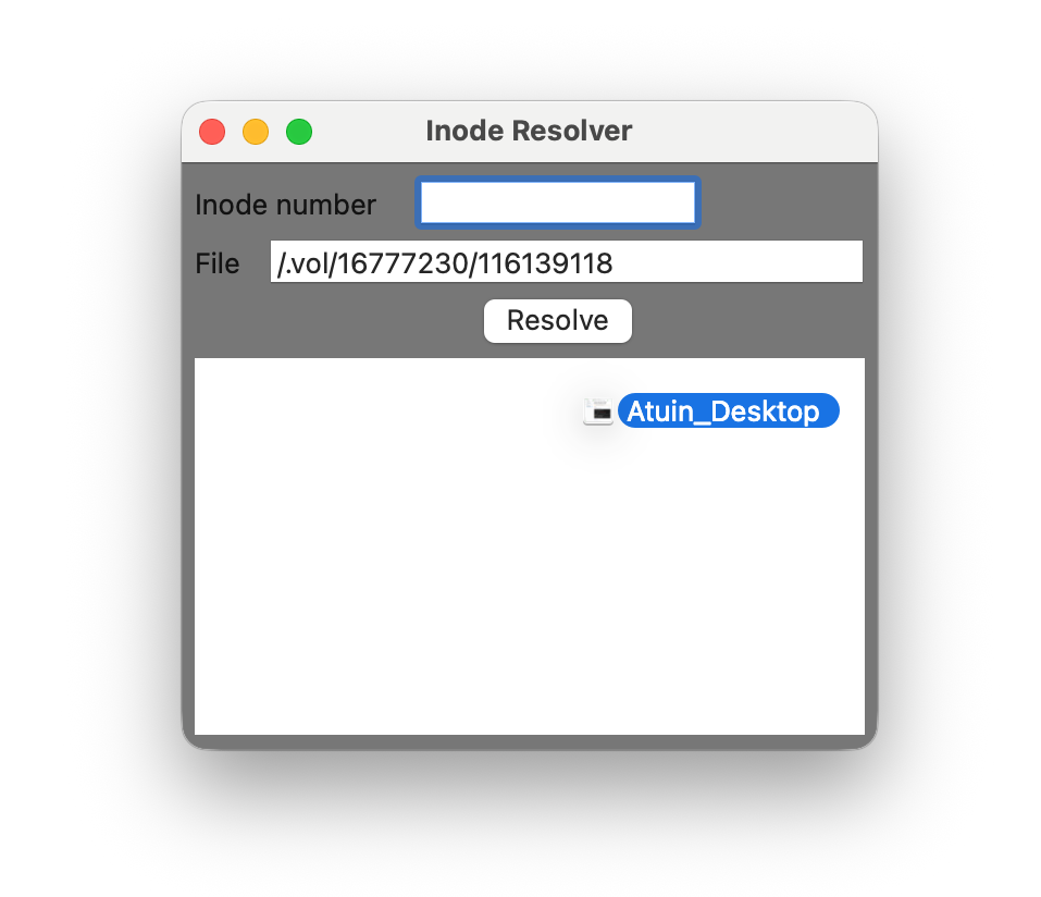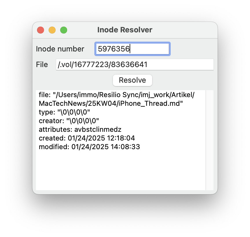 Übersetzung von Inode in DateipfadDie größte Hürde besteht darin, zu der langen Inode-Ziffernfolge den dazugehörigen Dateipfad zu eruieren. Howard Oakley hat dafür in sein kostenloses Programm