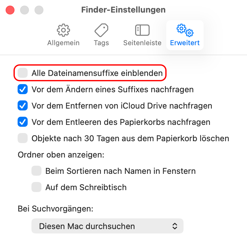 - Den Haken vor dem Eintrag „Alle Dateinamensuffixe einblenden“ setzen (oder entfernen)