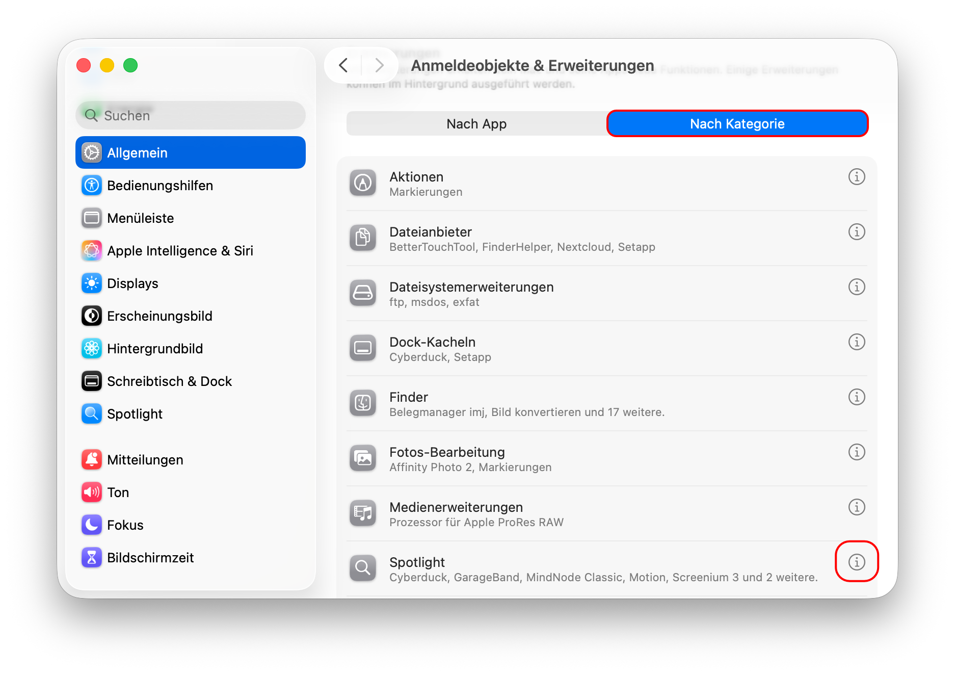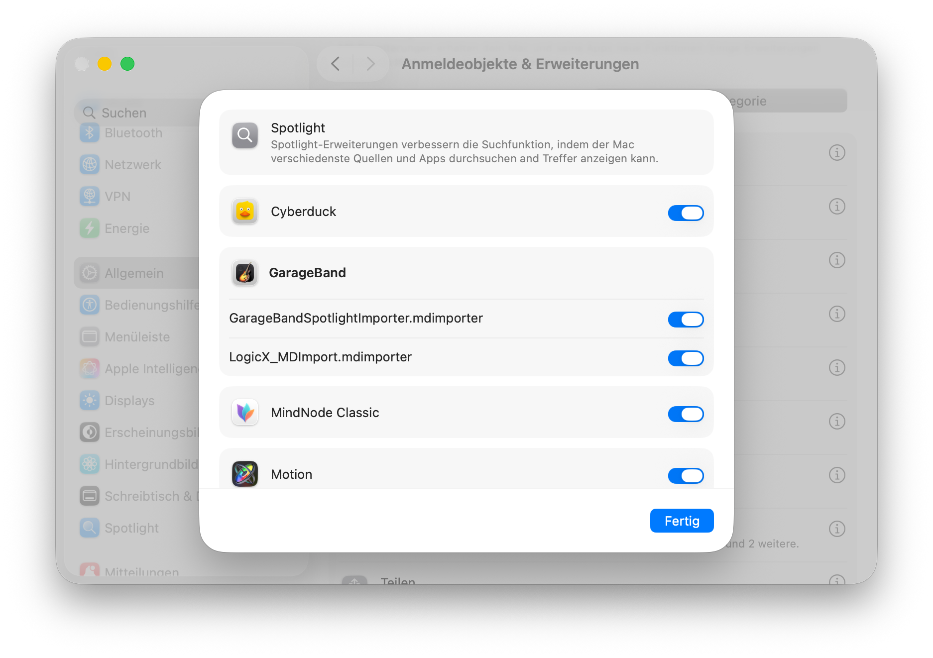 Unter Einstellungen/Allgemein/Anmeldeobjekte & Erweiterungen lässt sich eine Liste aller Spotlight-spezifischen Erweiterungen aufrufen, um diese gezielt zu deaktivieren.