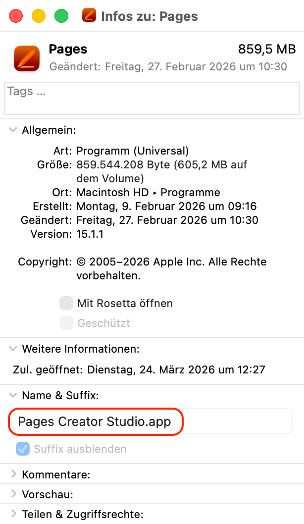 +I). Im Bereich „Name & Suffix“ erscheint der offizielle Name von Pages 15 – „Pages Creator Studio“.