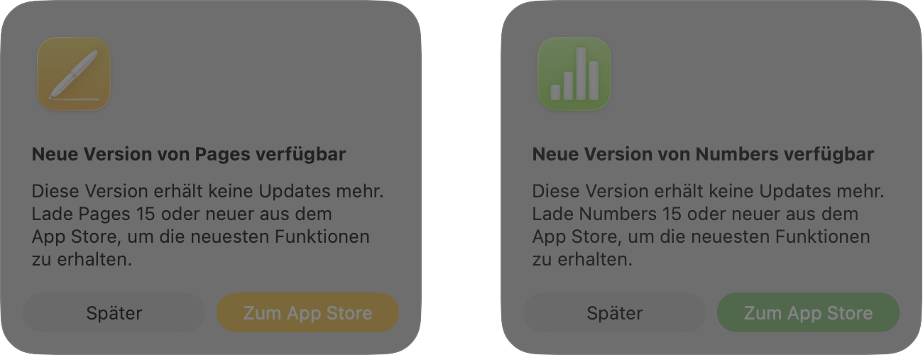 Sonderrechte für Apples eigene Apps?Laut Oakley musste Apple tief in die Trickkiste greifen, um zwei gleichnamige Apps in demselben Ordner erscheinen zu lassen; auch im „Über Pages“-Dialog sowie in verschiedenen Menüeinträgen musste Apple eingreifen, um eine konsistente Benennung durchzusetzen – allesamt Methoden, die bei anderen Entwicklern wahrscheinlich eine Zurückweisung im App Review auslösen würden. Auch mit den täglich erscheinenden Hinweisen auf die neue Version erlaubt sich Apple etwas, das anderen Entwicklern (hoffentlich) niemals gewährt würde.