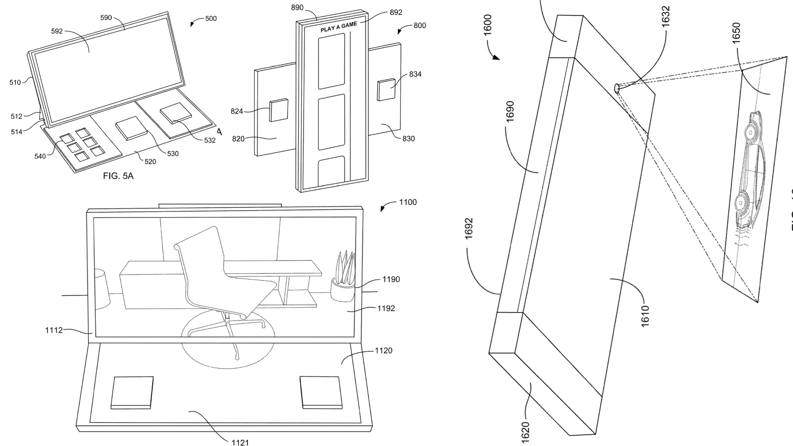 Unterschiedlichste FormenBei den exemplarischen Darstellungsformen lassen Apples Entwickler ihrer Fantasie freien Lauf – die Skizzen zeigen klappbare, drehbare, faltbare Konstruktionen, bei denen ein iPhone (oder iPad) mal hochkant, mal im Querformat zur Anwendung kommt. Manche Konfigurationen scheinen den Bildschirm sogar durch einen zusätzlichen Touchscreen zu erweitern. Ein anderes Modell integriert einen Projektor, welcher den Bildschirminhalt an eine Wand wirft.