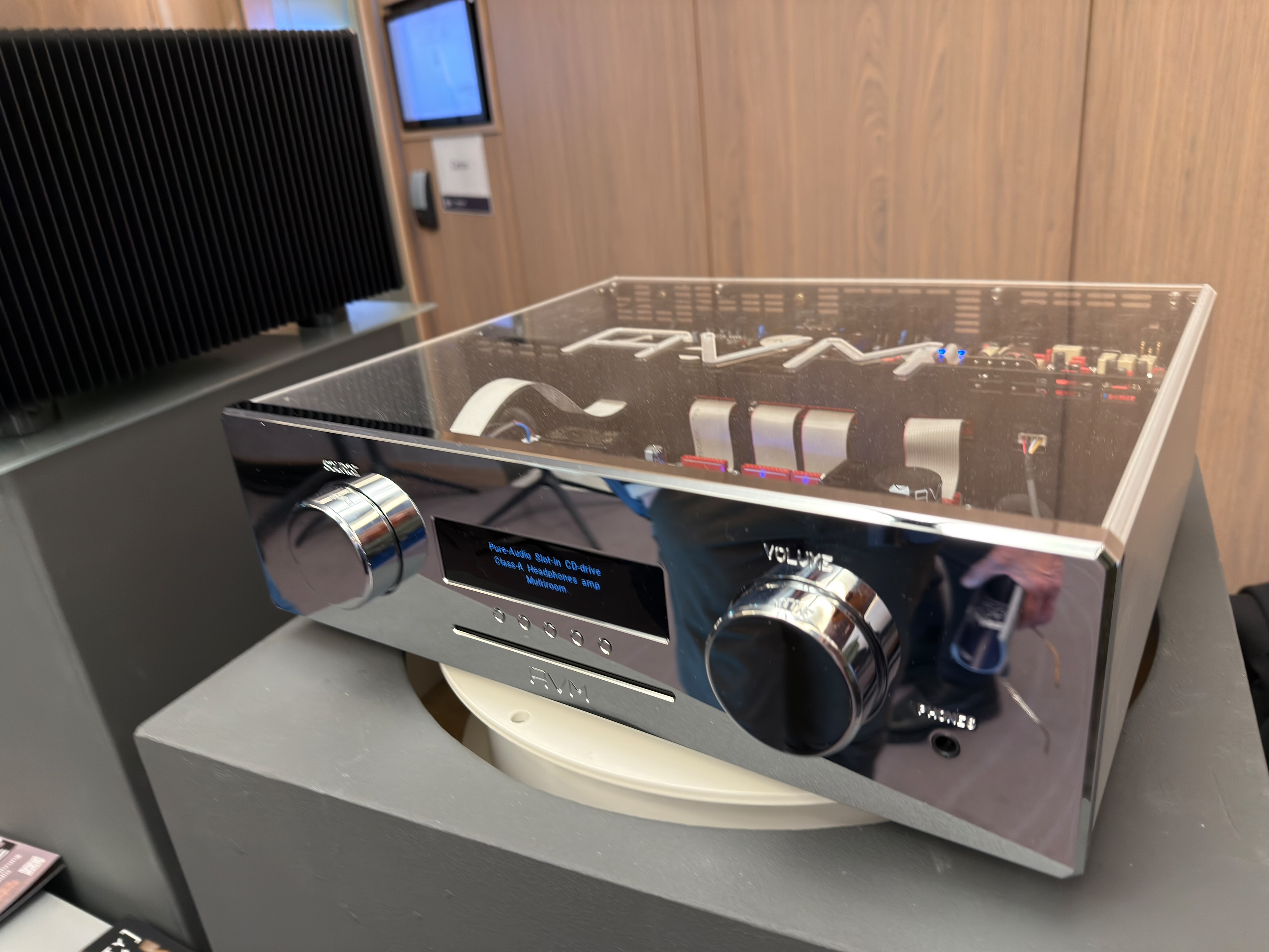 Vor dem AVM-Raum war das All-In-One-Topmodell der Marke zu sehen. Der AVM 30. Ein Streamer, CD-Player, Receiver, DAC und Vollverstärker Made in Germany. Hier mit der optional verchromten Front und einem Glasdeckel, der den Blick auf das komplexe Innenleben erlaubt.