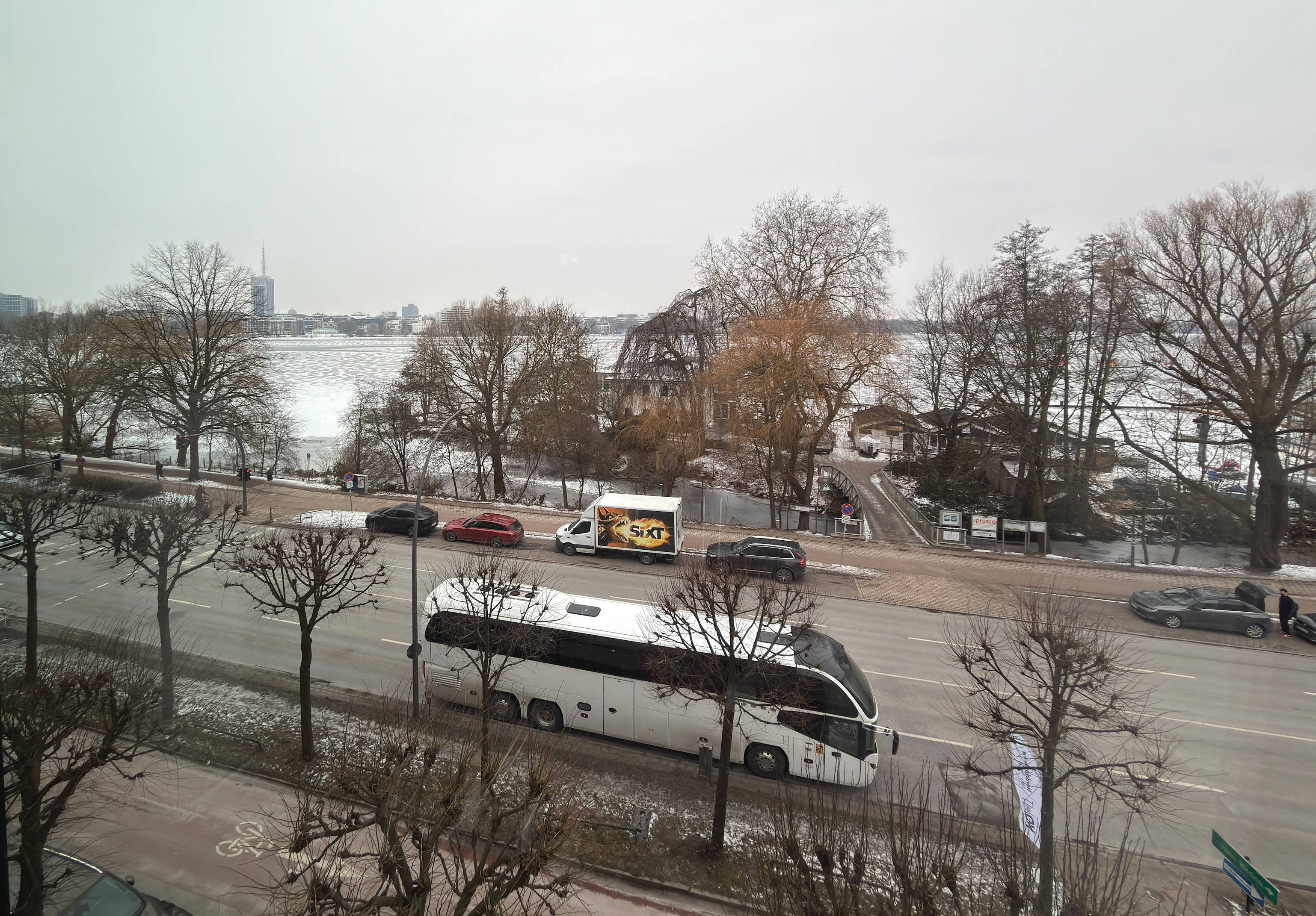 Kurzer Blick über die teilweise zugefrorene Alster. – Brrr! Wo stehen eigentlich die warmen Röhrenverstärker? – Überall verteilt auf der Messe natürlich.