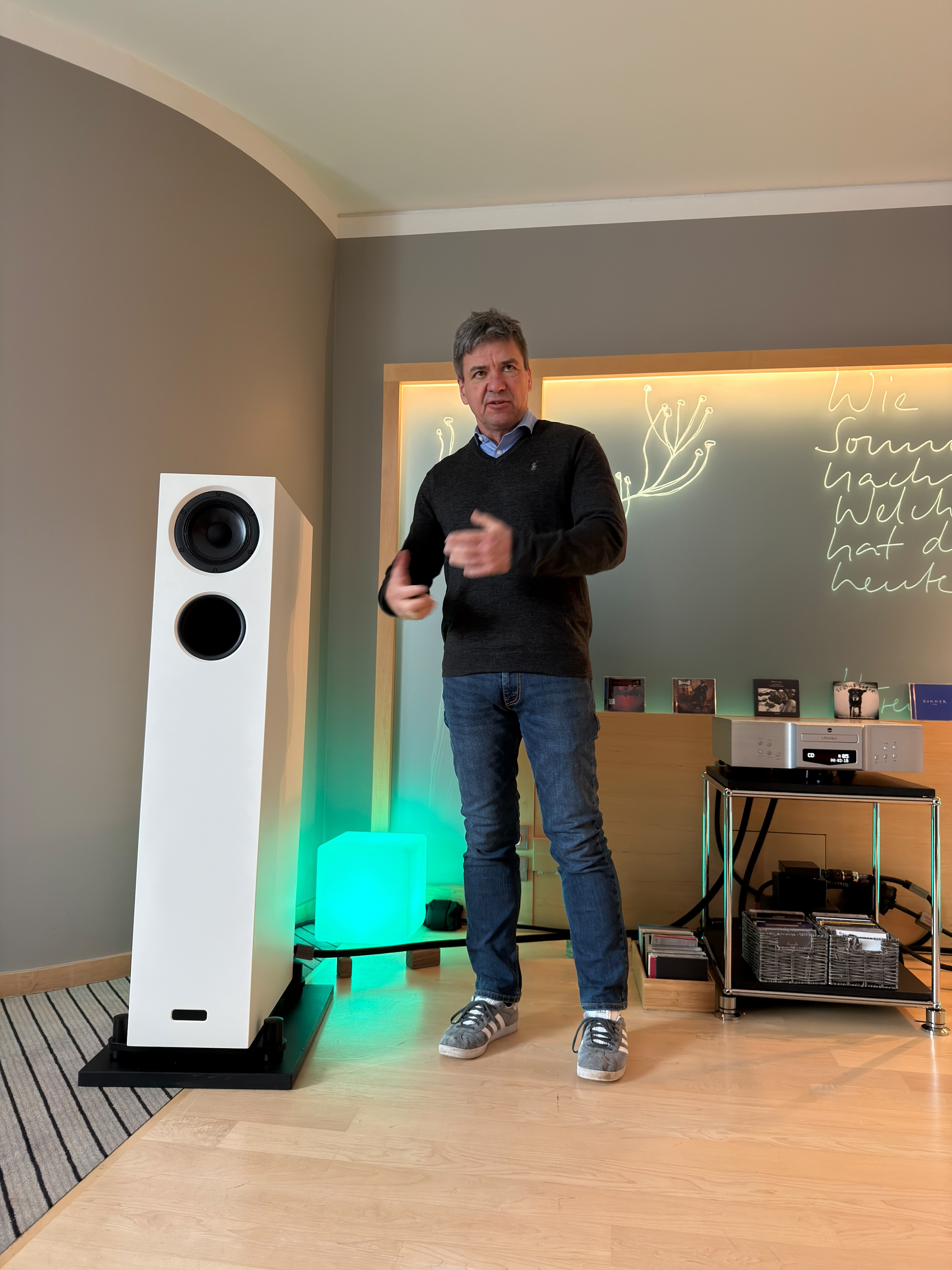 Ascendo ist vor allem im professionellen Bereich wie Kino eine bekannte Größe. Der Hersteller baut vielleicht die bestklingenden Kinolautsprechersysteme überhaupt und hält den Weltrekord für den größten Subwoofer-Treiber (100 Zoll). Doch auch HiFi liegt Ascendo-Chef Stefan Köpf (hier im Bild) sehr am Herzen. Hier erklärt er seinen aktiven Live 6 Humming Bird Aktiv Lautsprecher, die sich dank DSP und Einmessung flexibel an unterschiedliche Wohnraumverhältnisse anpassen lassen. Das klang vielversprechend, aber auch hier war die Musikauswahl für meinen Geschmack nicht aussagekräftig genug. Nichtsdestotrotz ein spannendes System!