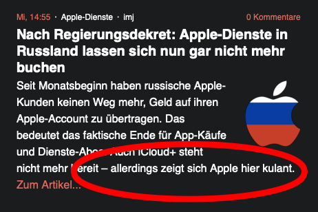 Wer sich ein Apple-Gerät zulegt, erhält damit ein umfangreiches Angebot an elektronischen Einkaufs- und Abonnementmöglichkeiten: Filme & Serien, Musik, Bücher, Podcasts – und den App Store, in den meisten Ländern die einzige erlaubte Quelle für Software auf den Mobilplattformen. Dazu kommt iCloud, mit dem sich mehrere Geräte reibungslos synchronisieren lassen. Für Nutzer in Russland fallen zukünftig alle Wege weg, über Apples Dienste einzukaufen. Der Grund: Die letzte Möglichkeit, Geldbeträge an Apple zu übermitteln, fällt weg.