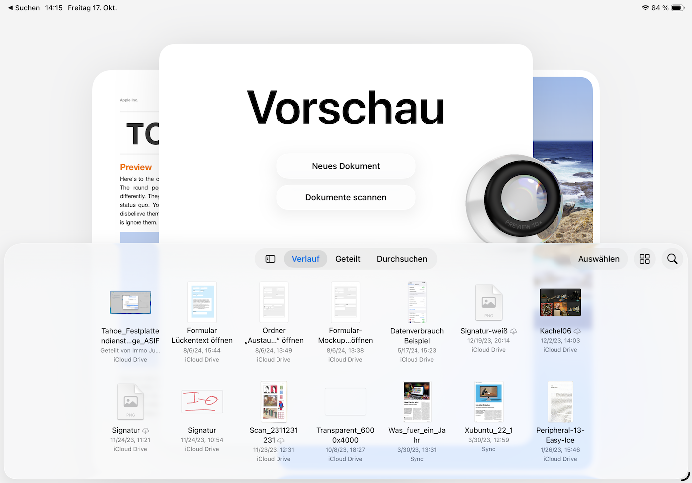 Dokumente scannenEntscheiden Sie sich für "Dokumente scannen", greift Vorschau auf die Kamera der Geräterückseite zu und aktiviert den Scan-Modus. Einige kennen diesen bereits, er beschränkte sich bisher allerdings auf die Notizen- sowie die Dateien-App. In diesem Modus können Sie seitenweise Briefe oder Buchkapitel (mit maximal 24 Seiten) abfotografieren, um sie zu einem PDF zusammenzufassen. Das so entstandene Dokument wird automatisch im Vorschau-Ordner der iCloud gesichert – so steht es auch auf anderen Geräten zur Verfügung. Das gilt ebenfalls für neu angelegte (leere) Dokumente sowie für Dateien, die in anderen Apps ihren Ursprung haben.