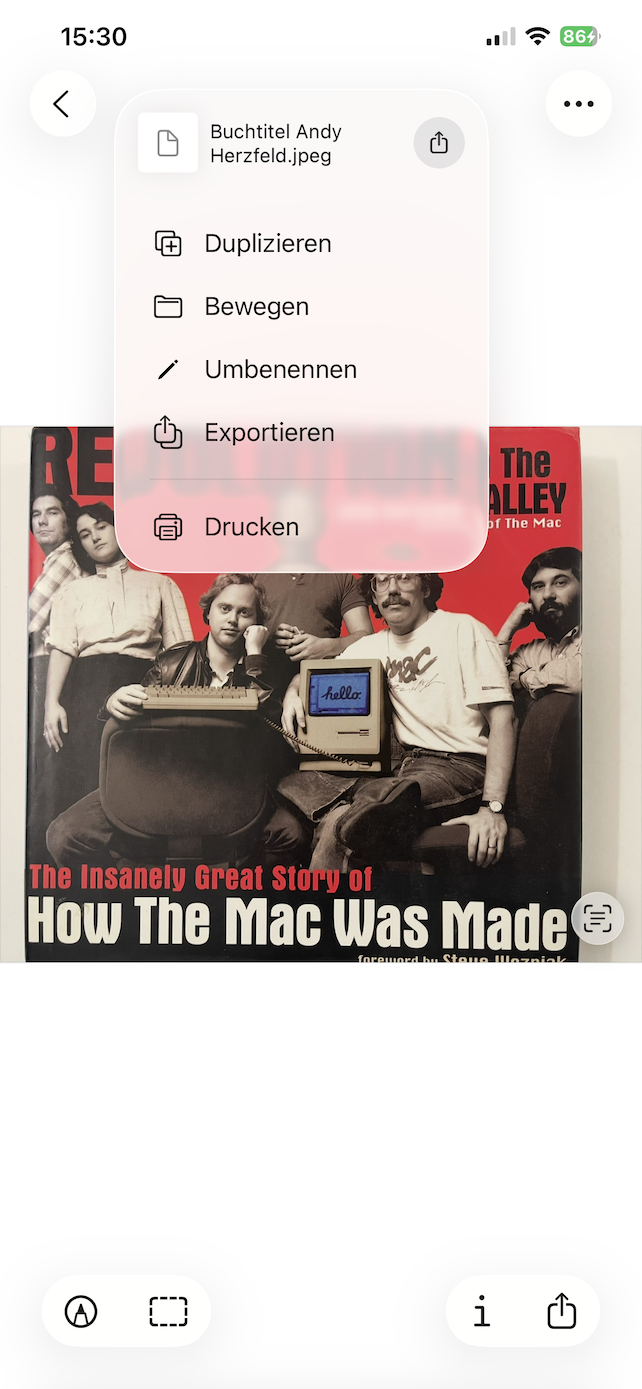 Die WerkzeugeDie angebotenen Werkzeuge erscheinen am iPad der Kopfzeile des Programms: Der oben links angezeigte Dateiname dient zugleich als (reduziertes) Ablagemenü, mit Sie das Dokument etwa umbenennen oder verschieben. Mittig befindet sich das pillenförmige Bearbeitungsmenü, mit der sich Bilder drehen, zuschneiden oder mit handgezeichneten Markierungen versehen lassen. Eine weitere Pille oben rechts offeriert weitere Werkzeuge. Ähnlich verhält es sich am iPhone, nur sind die beiden Menüs am unteren Bildschirmrand positioniert.