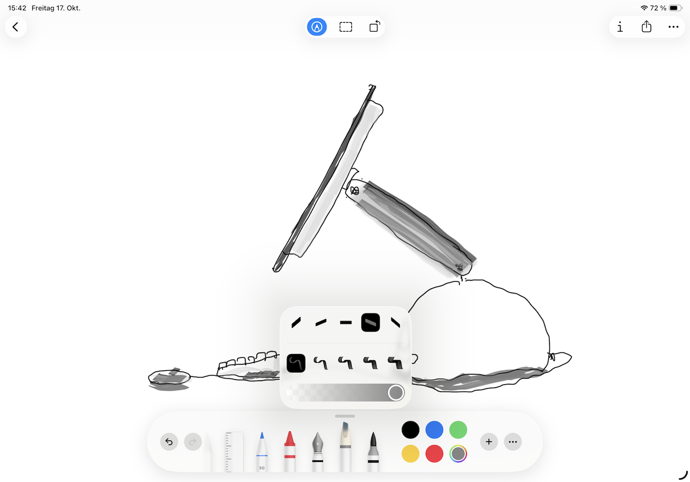 Zeichnen und kommentierenAuf Bildern und PDFs erscheinen die Zeichenwerkzeuge, welche Anwender aus der Notizen- und der iMessage-App kennen: Mit ihnen lassen sich per Hand oder Pencil Anmerkungen hinzufügen, Passagen hervorheben oder Illustrationen ergänzen. Acht Stifte stehen zur Auswahl; für jeden kan man Farbe, Strichbreite und Transparenz einstellen. Dazu gesellen sich Radierer, Auswahlstift sowie Lineal.