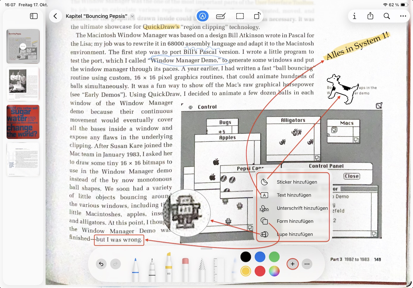 Etwas versteckt: Sticker, Lupe etc.Wer die Anmerkungswerkzeuge der Notizen genutzt hat, kennt vielleicht die zusätzlichen Elemente, welche sich im unscheinbaren Plus-Symbol rechts von der Stiftauswahl verbergen. Dank dieser müssen Sie sich nicht auf Ihre zeichnerischen und handschriftlichen Künste verlassen: Textelemente, geometrische Formen und iMessage-Sticker finden auf diesem Weg Einzug in das aktuelle Dokument. Die Lupe erlaubt es, einen Teil des Bildes zu vergrößern – mittels zwei Anfassern regeln Sie Größe und Zoomfaktor.