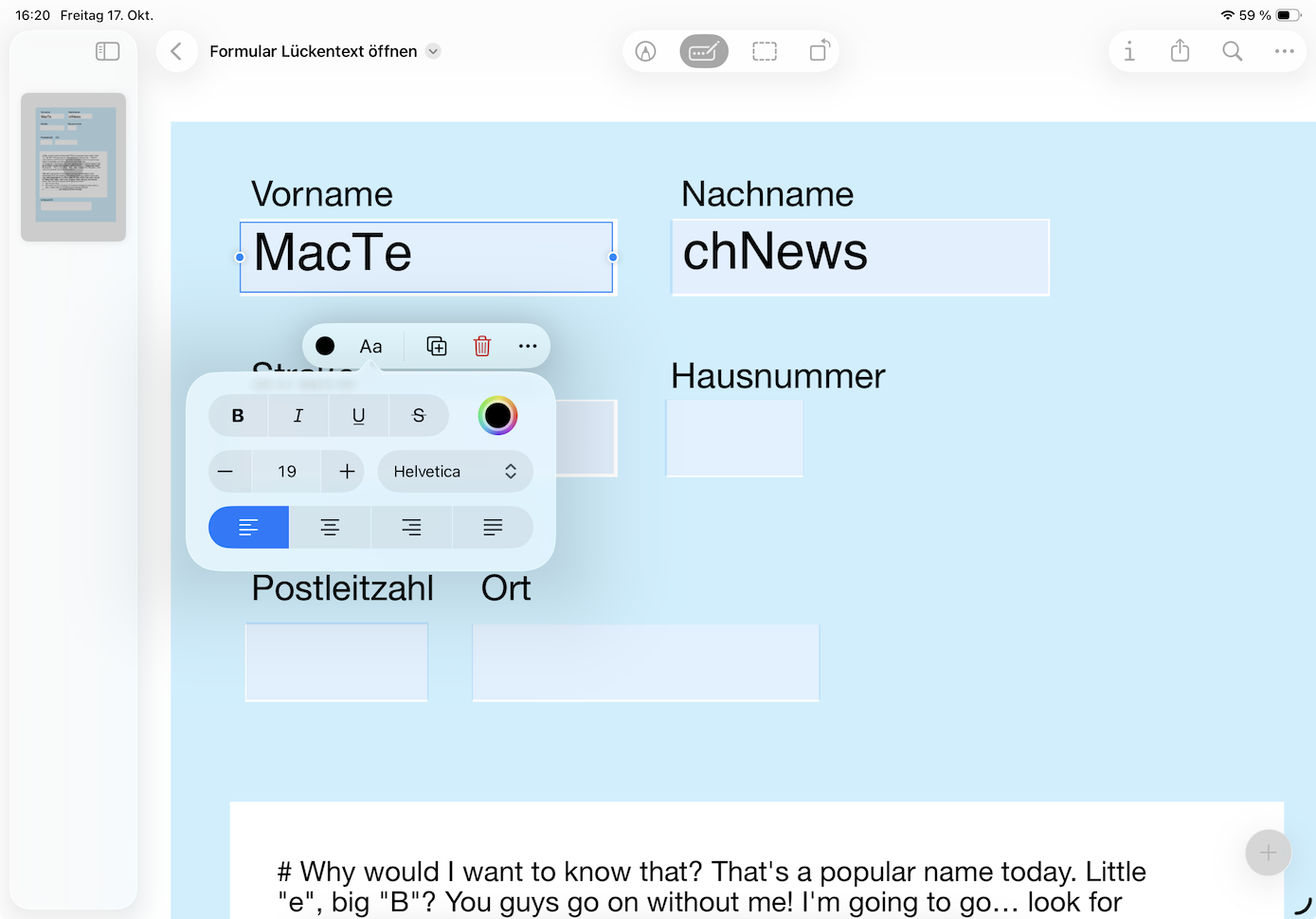 Formulare ausfüllenDie bisher in der Dateien-App versteckten Formularwerkzeuge sind nun ebenfalls in die Vorschau-App umgezogen. Sie erscheinen, sobald Sie ein PDF-Dokument geöffnet haben – erkennbar am zusätzlichen Icon, bestehend aus einem abgerundeten Rechteck mit drei Punkten und einem Stift. Wenn der Modus aktiv ist, erkennt Vorschau ausfüllbare Felder automatisch – ob sie vom Versender des PDFs bereits angelegt wurden oder nicht. Fehlt eines, können Sie über das Plus-Icon in der unteren rechten Ecke ein neues hinzufügen. Für jedes Feld legen Sie Schriftart, -farbe und -größe auf Wunsch in einem Schwebemenü fest.