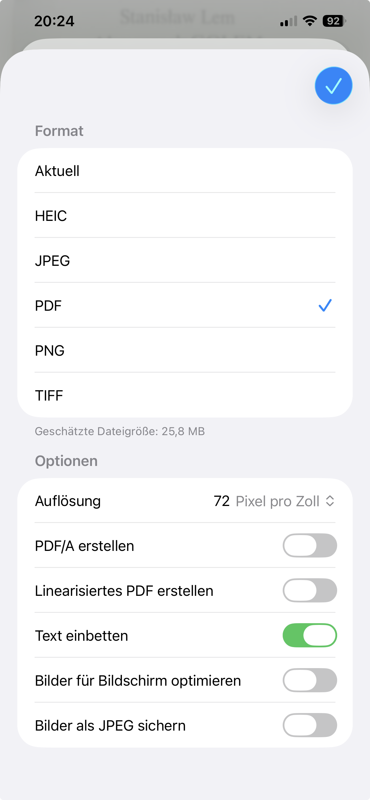 Beim Teilen: Format wählenUm das vollendete Bild oder PDF zu exportieren, nutzen Sie den Teilpfeil. Achten Sie dabei auf das kleine Extramenü namens "Optionen", das rechts neben "Kopie senden" erscheint (und fast vom "X" verdeckt wird). Darin bestimmen Sie explizit, in welchem Format sich das Dokument auf die Reise macht. Je nach Format können Sie noch weitere Einstellungen vornehmen, etwa bei PND-Dateien den Hintergrund transparent lassen oder bei PDFs den erkannten Text integrieren.