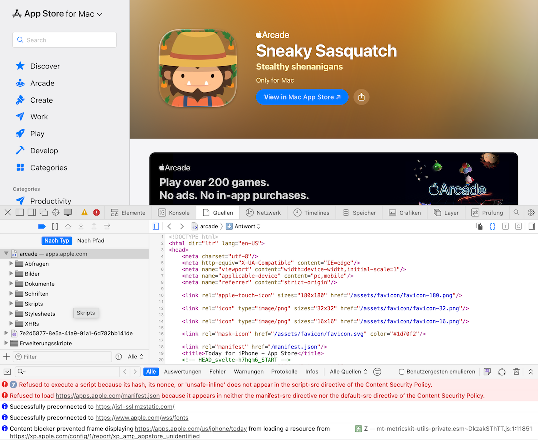 apps.apple.com auf und blendet den Seitenquelltext ein (via Menü „Entwickler“ oder per