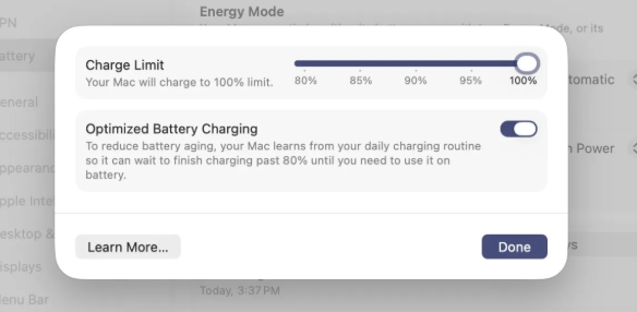 gedacht sind. Wer die ungesünderen Ladestände von über 80 % dennoch partout vermeiden möchte, kann ab macOS 26.4 genaue Einstellungen vornehmen. Anstatt den Mac automatisch optimieren zu lassen, regelt ein Slider fortan auf Wunsch harte Ladelimits. Diese reichen in 5er-Schritten von 80 bis 100 Prozent und folgen somit dem Beispiel von iOS.