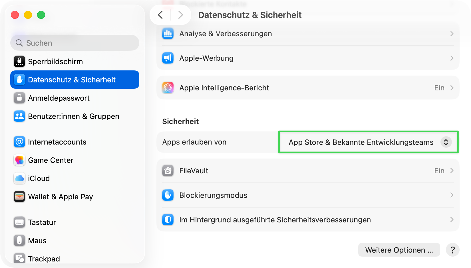Die Einstellung in "Datenschutz & Sicherheit" erlaubt standardmäßig, dass nur notarisierte Softwaretitel problemlos starten.