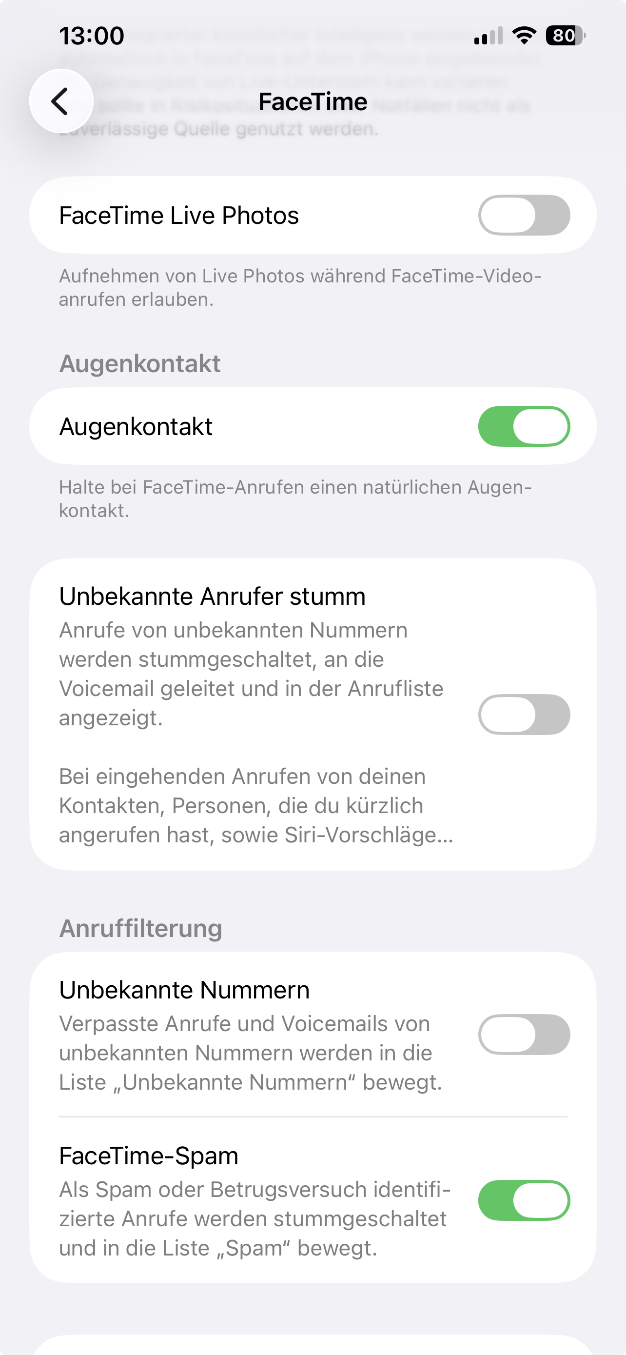 In den FaceTime-Einstellungen können iPhone-Nutzer auf Wunsch die Augenkontakt-Funktion aktivieren.