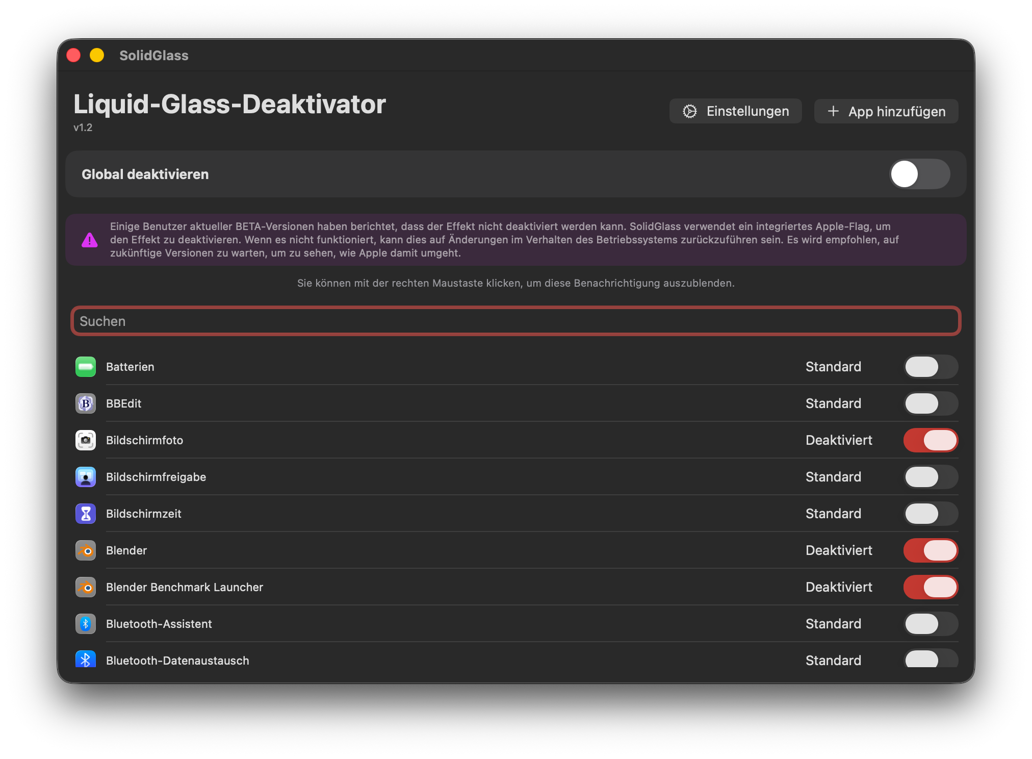 SolidGlass ermöglicht das gezielte Deaktivieren von Liquid-Glass-Effekten.