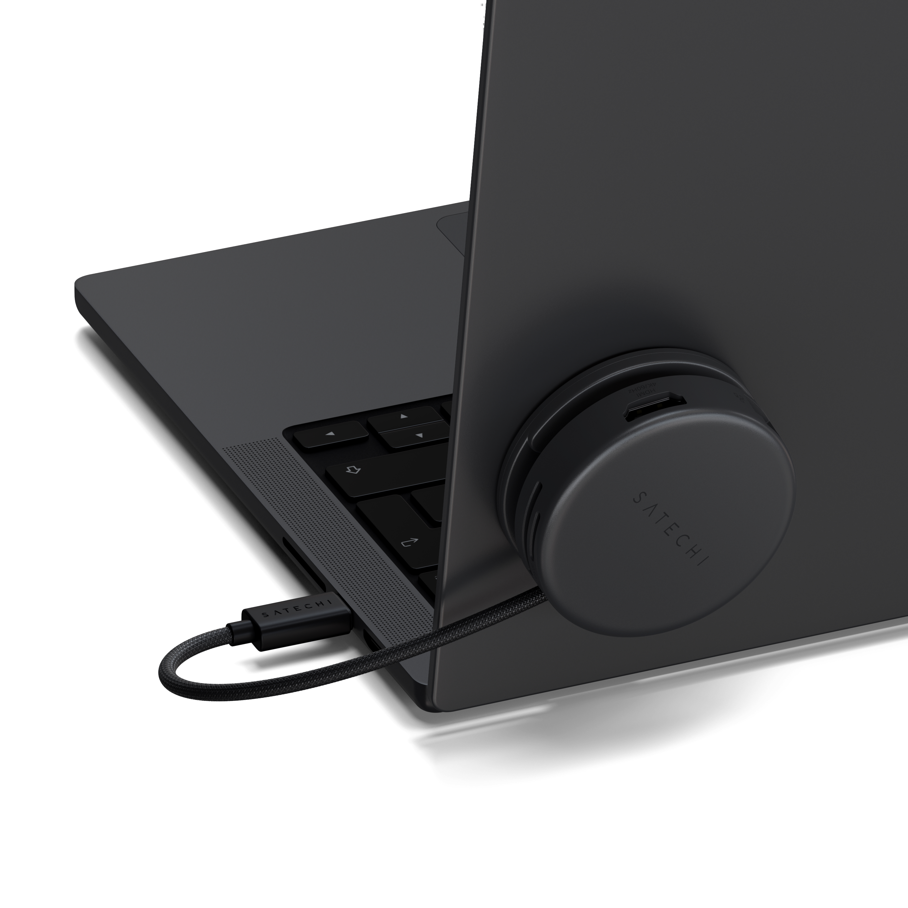 Der Adapter bündelt Ladefunktion, Displayausgabe, Netzwerkzugang und Datenübertragung in einem einzigen Zubehör und hebt sich durch seine magnetische Befestigung sowie das spiralförmig aufgebaute, geflochtene USB-C-Host-Kabel von klassischen Multiport-Lösungen ab.