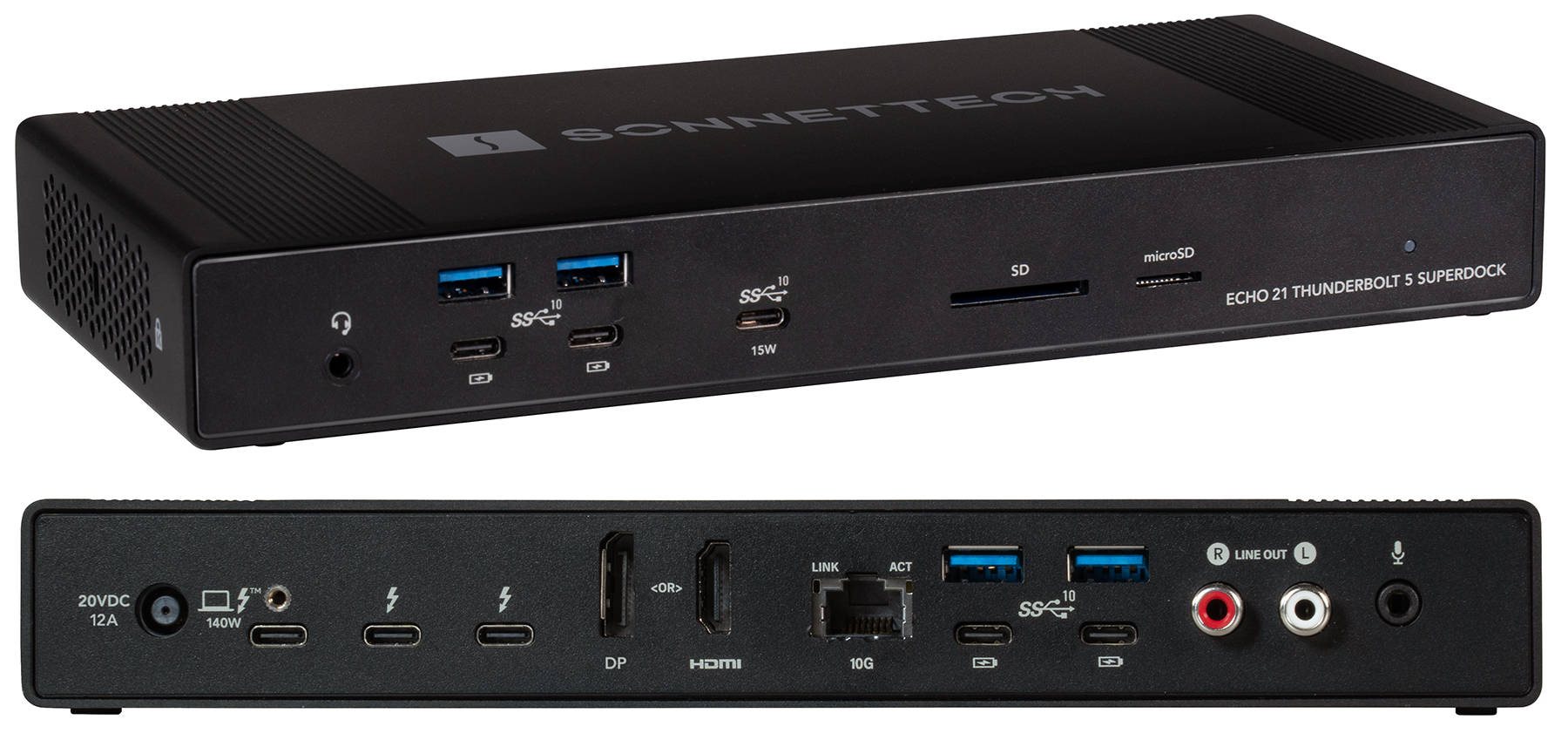 SONNET ECHO 20 UND ECHO 21: NEUE THUNDERBOLT-5-DOCKINGSTATIONEN MIT 10GBEDamit Sie nicht lange im Text suchen müssen, hier die wichtigste Information vorab: Die Modelle Echo 20 und 21 unterscheiden sich nur in einem Punkt: Das Echo 21 hat einen internen Slot für M.2 SSD-Module, das Echo 20 nicht.