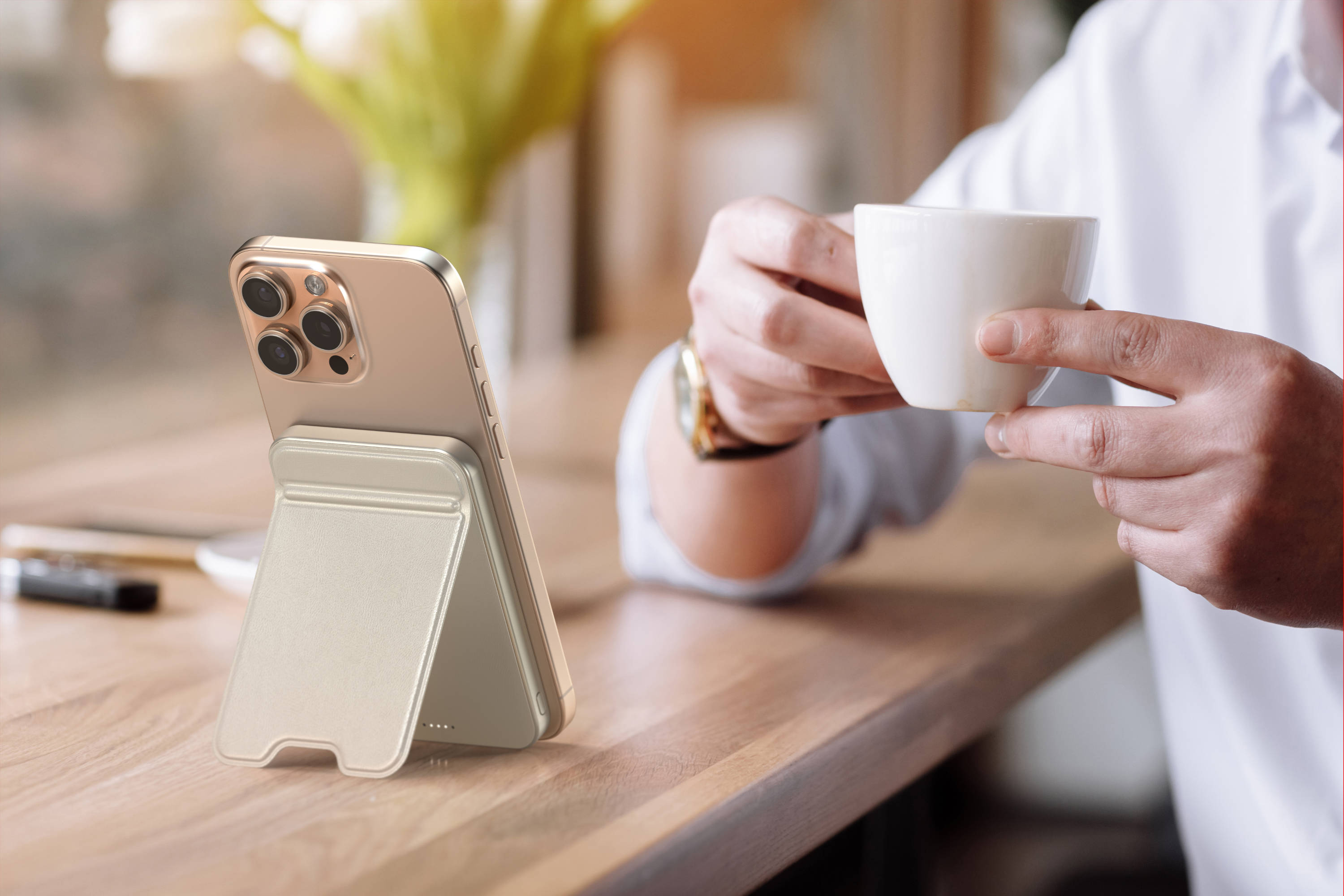 OntheGo Magnetic Qi2 Powerbank Stand 5000/ 10000 mAh Sand/Black:- Magnetische Powerbank mit Qi2 Wireless Charging und 5.000 bzw. 10.000 mAh Kapazität