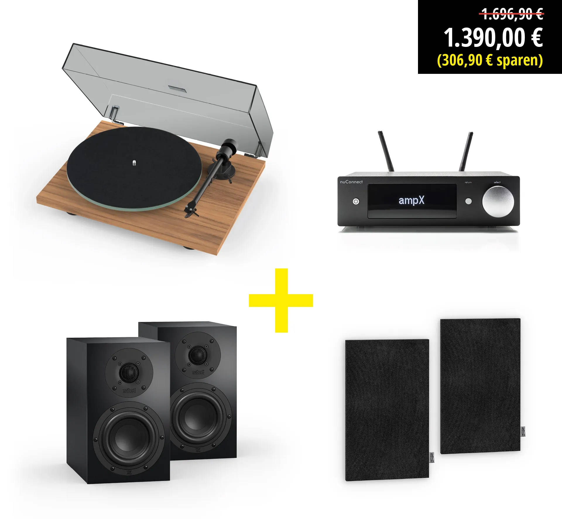 Pro-Ject T1 EVO. Der Plattenspieler ist auf einen unkomplizierten Start ausgelegt und macht das Bundle zu einer stimmigen Lösung für alle, die ohne Umwege in die Welt der Schallplatte einsteigen möchten.