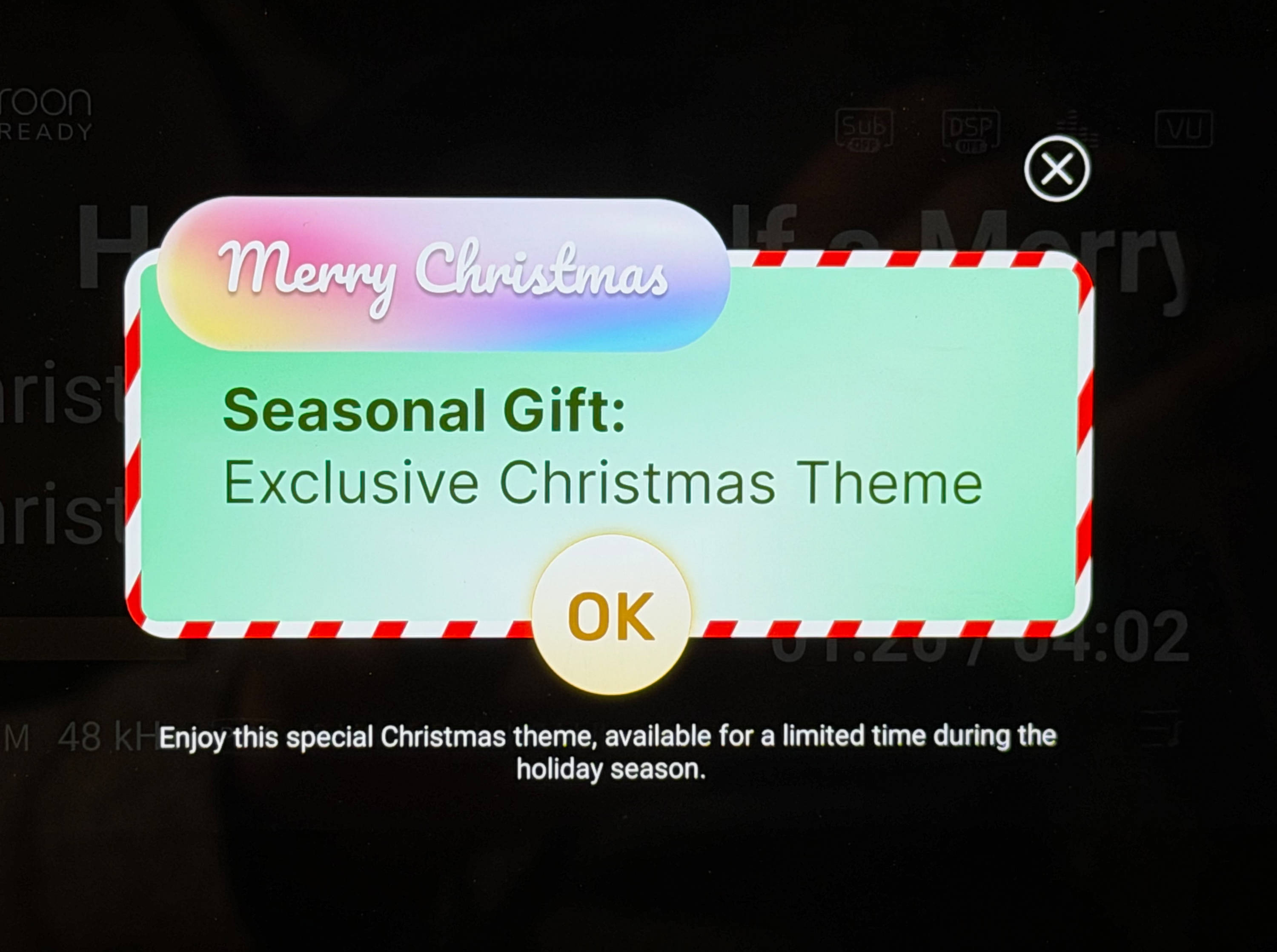 Testbericht) nach dem Einschalten mit einem Weihnachtsgruß und dem Hinweis, dass ein besonderer Weihnachts-Bildschirm zur Verfügung stünde. Passenderweise hatte ich in den freitäglichen Neuheiten auf